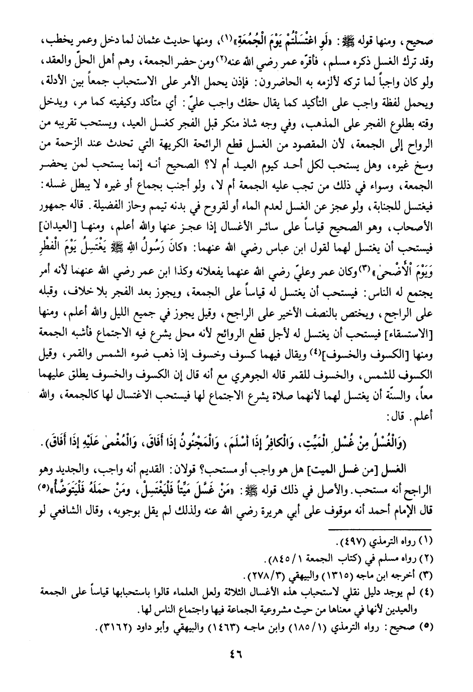 (لَو اغتسلتم يَوْم الْجُمُعَة) وَمِنْهَا حَدِيث عُثْمَان لما دخل وَعمر يخْطب وَقد ترك الْغسْل ذكره مُسلم فأقره عمر رَضِي الله عَنهُ وَمن حضر الْجُمُعَة وهم أهل الْحل وَالْعقد وَلَو كَانَ وَاجِبا لما تَركه لألزمه بِهِ الْحَاضِرُونَ فَإِذن يحمل الْأَمر على الِاسْتِحْبَاب جمعا بَين الْأَدِلَّة وَيحمل لَفْظَة وَاجِب على التَّأْكِيد كَمَا يُقَال حَقك وَاجِب عَليّ أَي متأكد وكيفيته كَمَا مر وَيدخل وقته بِطُلُوع الْفجْر على الْمَذْهَب وَفِي وَجه شَاذ مُنكر قبل الْفجْر كَغسْل الْعِيد وَيسْتَحب تقريبه من الرواح إِلَى الْجُمُعَة لِأَن الْمَقْصُود من الْغسْل قطع الرَّائِحَة الكريهة الَّتِي تحدث عِنْد الزحمة من وسخ غَيره وَهل يسْتَحبّ لكل أحد كَيَوْم الْعِيد أم لَا الصَّحِيح أَنه إِنَّمَا يسْتَحبّ لمن يحضر الْجُمُعَة وَسَوَاء فِي ذَلِك من تجب عَلَيْهِ الْجُمُعَة أم لَا وَلَو أجنب بجماع أَو غَيره لَا يبطل غسله فيغتسل للجنابة وَلَو عجز عَن الْغسْل لعدم المَاء أَو لقرح فِي بدنه تيَمّم وَحَازَ الفضيله قَالَ جُمْهُور الْأَصْحَاب وَهُوَ الصَّحِيح قِيَاسا على سَائِر الأغسال إِذا عجز عَنْهَا وَالله أعلم وَمِنْهَا العيدان فَيُسْتَحَب أَن يغْتَسل لَهما لقَوْل ابْن عَبَّاس رَضِي الله عَنْهُمَا