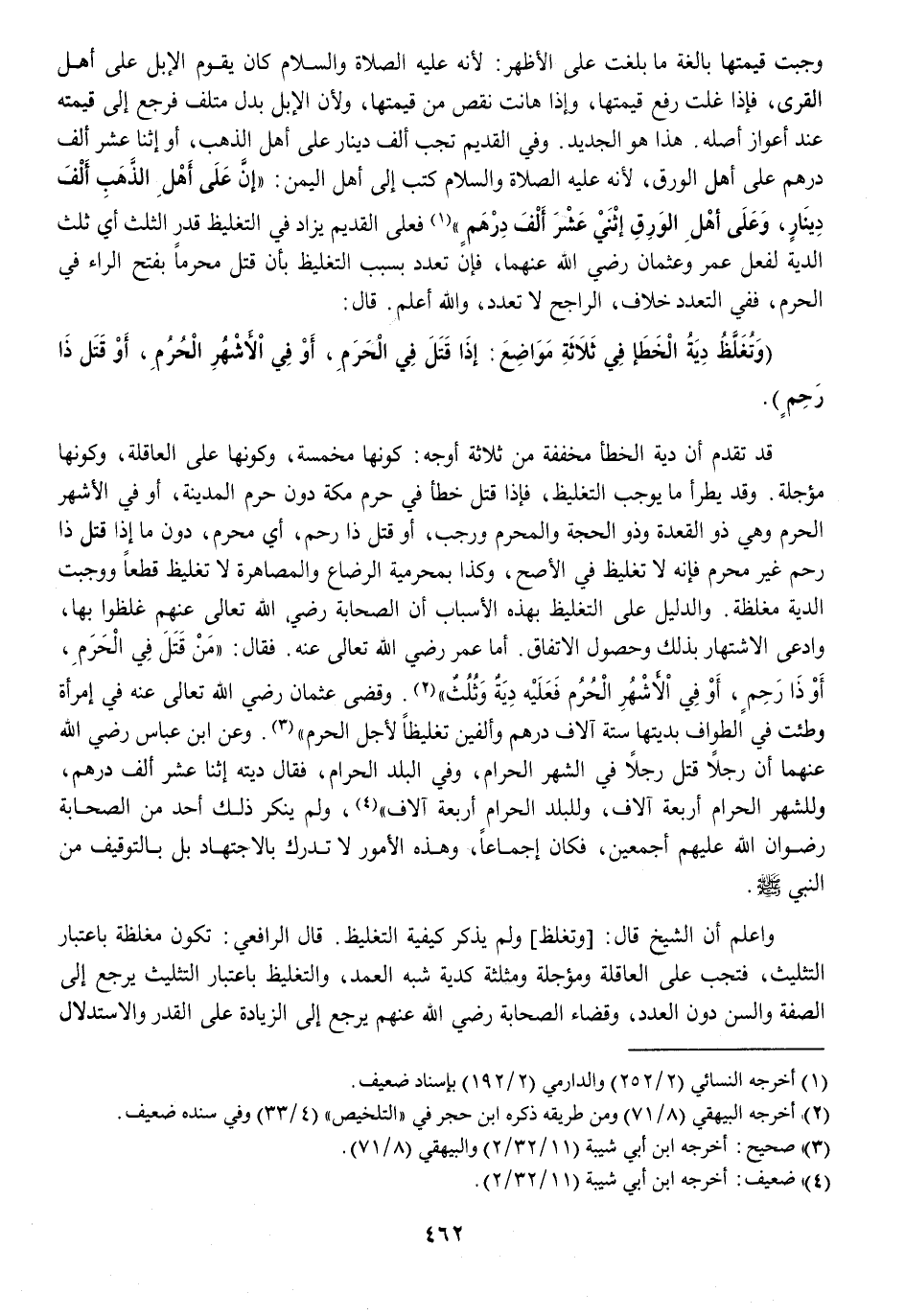 قد تقدم أَن دِيَة الْخَطَأ مُخَفّفَة من ثَلَاثَة أوجه كَونهَا مخمسة وَكَونهَا على الْعَاقِلَة وَكَونهَا مُؤَجّلَة وَقد يطْرَأ مَا يُوجب التَّغْلِيظ فَإِذا قتل خطأ فِي حرم مَكَّة دون حرم الْمَدِينَة أَو فِي الْأَشْهر الْحرم وَهِي ذُو الْقعدَة وَذُو الْحجَّة وَالْمحرم وَرَجَب أَو قتل ذَا رحم أَي محرم دون مَا إِذا قتل ذَا رحم غير محرم فَإِنَّهُ لَا تَغْلِيظ فِي الْأَصَح وَكَذَا بمحرمية الرَّضَاع والمصاهرة لَا تَغْلِيظ قطعا وَوَجَبَت الدِّيَة مُغَلّظَة وَالدَّلِيل على التَّغْلِيظ بِهَذِهِ الْأَسْبَاب أَن الصَّحَابَة رَضِي الله تَعَالَى عَنْهُم غلظوا بهَا وَادّعى الاشتهار بذلك وَحُصُول الِاتِّفَاق أما عمر رَضِي الله تَعَالَى عَنهُ فَقَالَ من قتل فِي الْمحرم أَو ذَا رحم أَو فِي الْأَشْهر الْحرم فَعَلَيهِ دِيَة وَثلث وَقضى عُثْمَان رَضِي الله تَعَالَى عَنهُ فِي امْرَأَة وطِئت فِي الطّواف بديتها سِتَّة آلَاف دِرْهَم وألفين تَغْلِيظًا لأجل الْحرم وَعَن ابْن عَبَّاس رَضِي الله عَنْهُمَا أَن رجلا قتل رجلا فِي الشَّهْر الْحَرَام وَفِي الْبَلَد الْحَرَام فَقَالَ دِيَته اثْنَا عشر ألف دِرْهَم وللشهر الْحَرَام أَرْبَعَة آلَاف وللبلد الْحَرَام أَرْبَعَة آلَاف وَلم يُنكر ذَلِك أحد من الصَّحَابَة رضوَان الله عَلَيْهِم أَجْمَعِينَ فَكَانَ إِجْمَاعًا وَهَذِه الْأُمُور لَا تدْرك بِالِاجْتِهَادِ بل بالتوقيف من النَّبِي صلى الله عَلَيْهِ وَسلم
