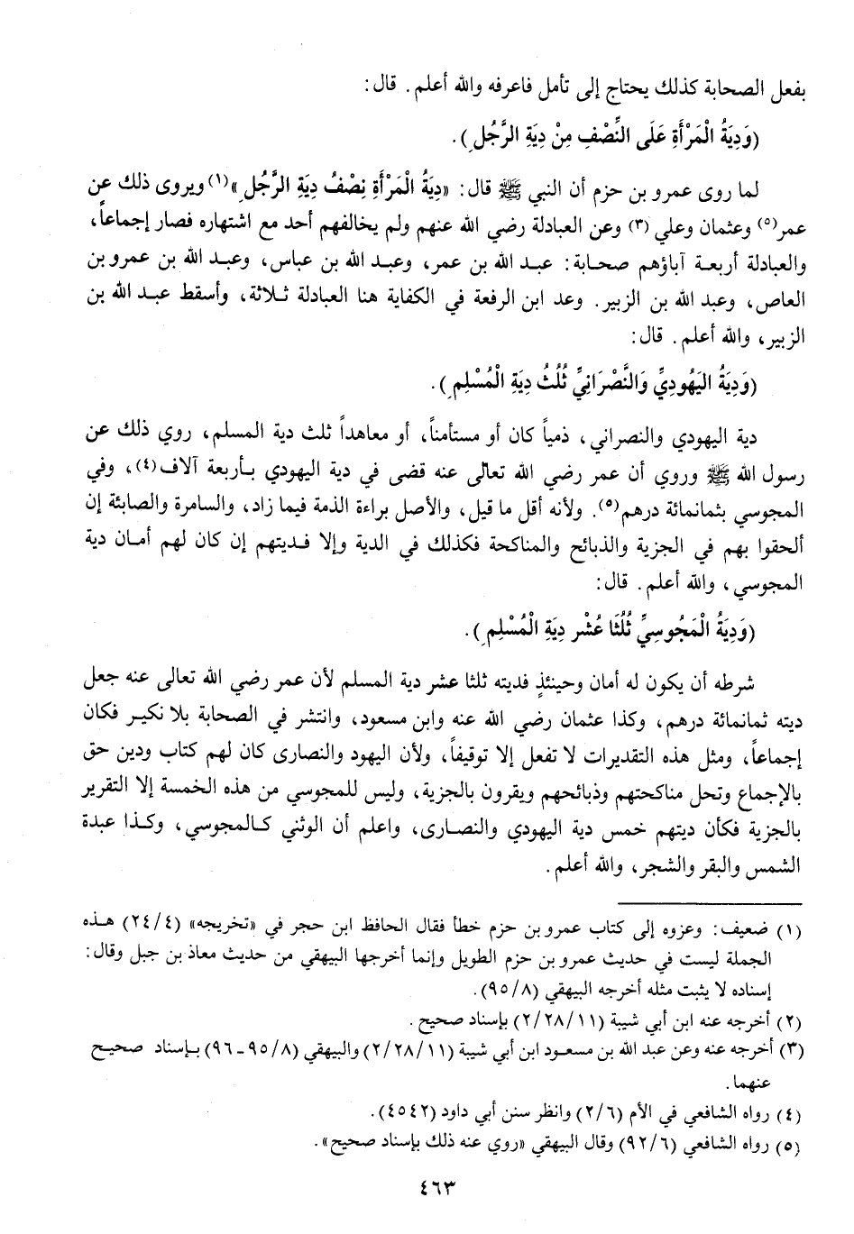 لما روى عَمْرو بن حزم أَن النَّبِي صلى الله عَلَيْهِ وَسلم قَالَ دِيَة الْمَرْأَة نصف دِيَة الرجل ويروى ذَلِك عَن عمر وَعُثْمَان وَعلي وَعَن العبادلة رَضِي الله عَنْهُم وَلم يخالفهم أحد مَعَ اشتهاره فَصَارَ إِجْمَاعًا والعبادلة أَرْبَعَة آباؤهم صحابة عبد الله بن عمر وَعبد الله بن عَبَّاس وَعبد الله بن عَمْرو بن الْعَاصِ وَعبد الله بن الزبير وعد ابْن الرّفْعَة فِي الْكِفَايَة هُنَا العبادلة ثَلَاثَة وَأسْقط عبد الله بن الزبير وَالله أعلم قَالَ
