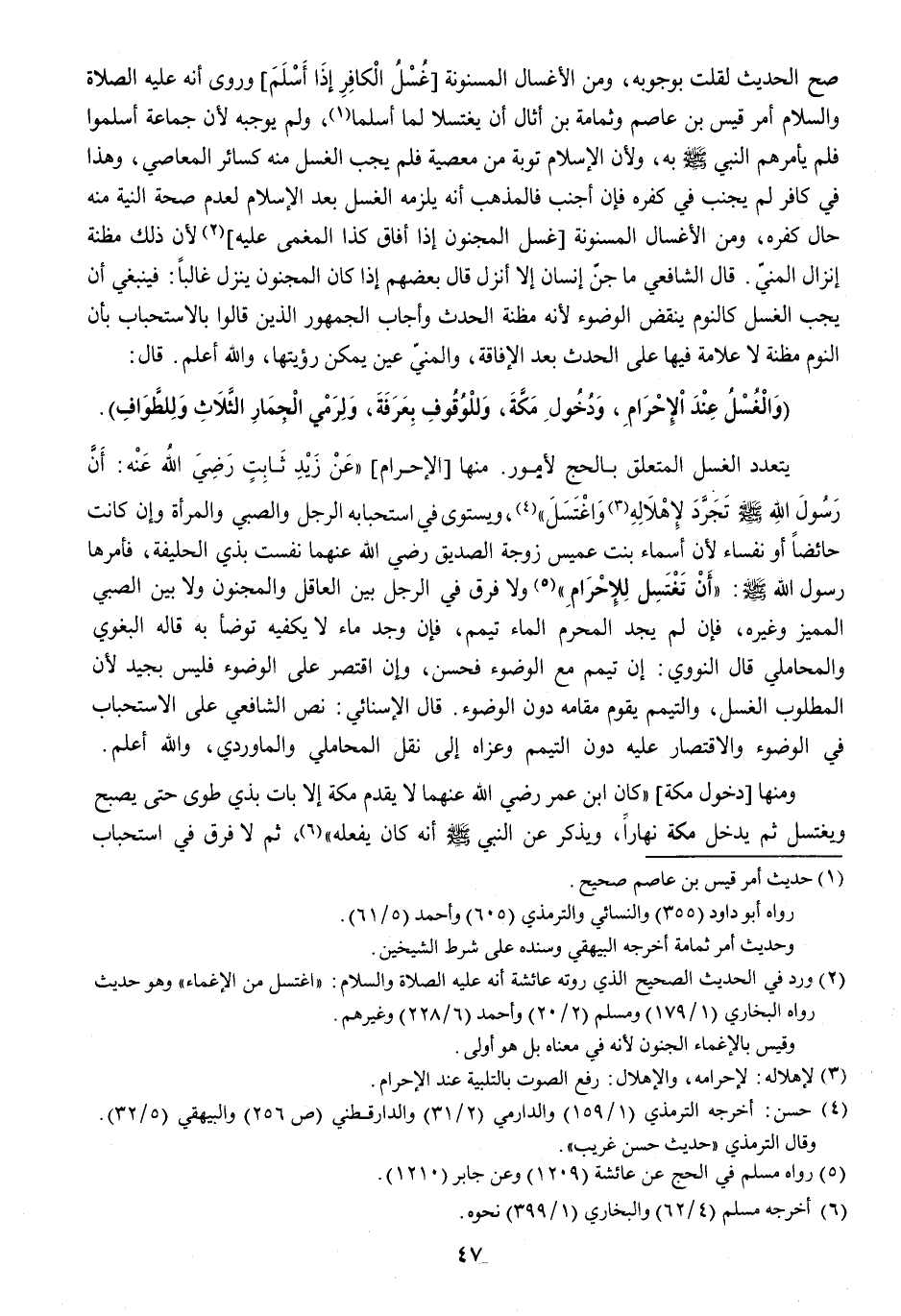 صَحَّ الحَدِيث لَقلت بِوُجُوبِهِ وَمن الأغسال المسنونة غسل الْكَافِر إِذا أسلم وَرُوِيَ أَنه عَلَيْهِ الصَّلَاة وَالسَّلَام أَمر قيس بن عَاصِم وثمامة بن أَثَال أَن يغتسلا لما أسلما وَلم يُوجِبهُ لِأَن جمَاعَة أَسْلمُوا فَلم يَأْمُرهُم النَّبِي صلى الله عَلَيْهِ وَسلم بِهِ وَلِأَن الْإِسْلَام تَوْبَة من مَعْصِيّة فَلم يجب الْغسْل مِنْهُ كَسَائِر الْمعاصِي وَهَذَا فِي كَافِر لم يجنب فِي كفره فَإِن أجنب فَالْمَذْهَب أَنه يلْزمه الْغسْل بعد الْإِسْلَام لعدم صِحَة النِّيَّة مِنْهُ حَال كفره وَمن الأغسال المسنونة غسل الْمَجْنُون إِذا أَفَاق كَذَا الْمغمى عَلَيْهِ لِأَن ذَلِك مَظَنَّة إِنْزَال الْمَنِيّ قَالَ الشَّافِعِي مَا جن إِنْسَان إِلَّا أنزل قَالَ بَعضهم إِذا كَانَ الْمَجْنُون ينزل غَالِبا فَيَنْبَغِي أَن يجب الْغسْل كالنوم ينْقض الْوضُوء لِأَنَّهُ مَظَنَّة الْحَدث وَأجَاب الْجُمْهُور الَّذين قَالُوا بالاستحباب بِأَن النّوم مَظَنَّة لَا عَلامَة فِيهَا على الْحَدث بعد الْإِفَاقَة والمني عين يُمكن رؤيتها وَالله أعلم قَالَ