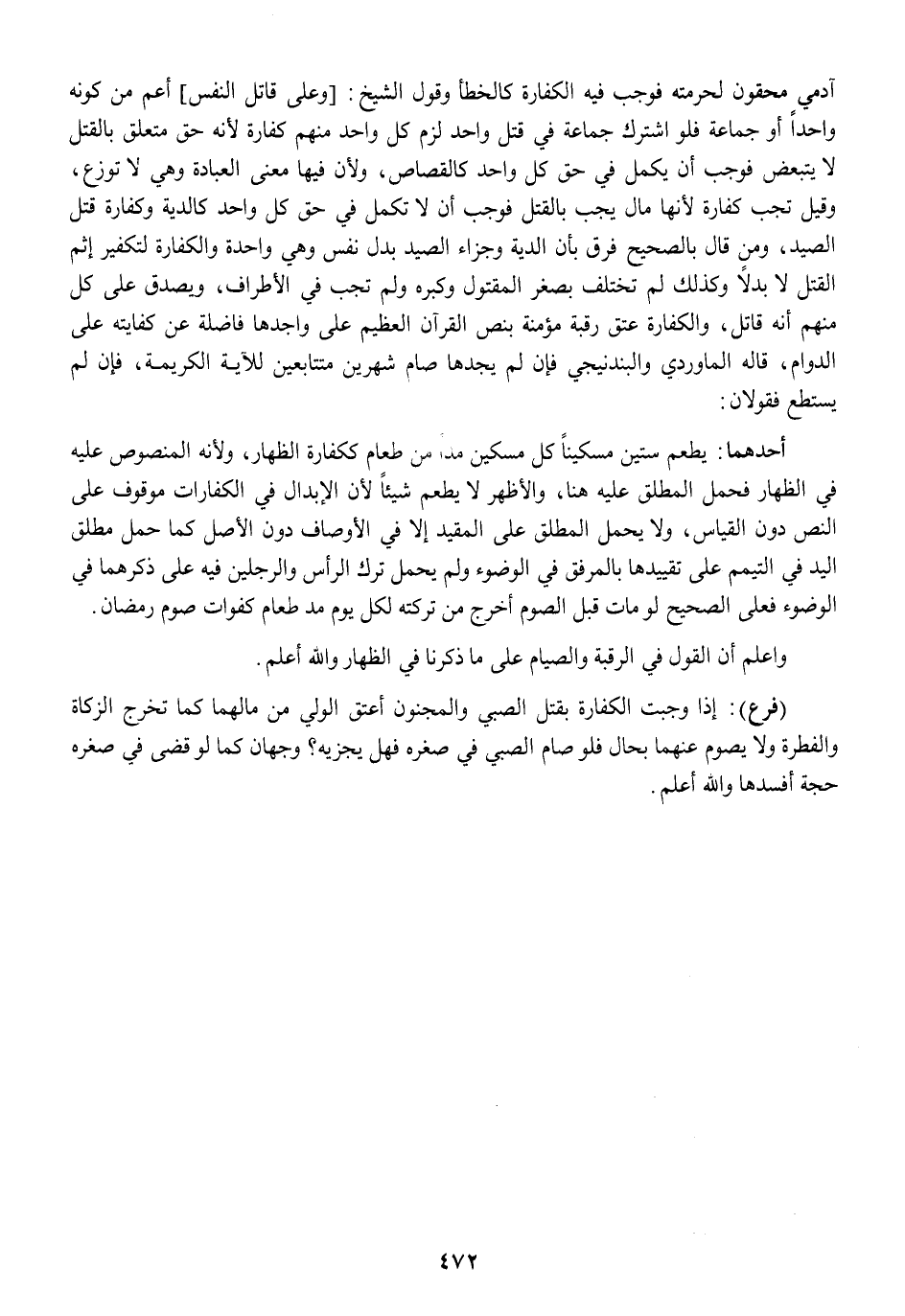 آدَمِيّ محقون لِحُرْمَتِهِ فَوَجَبَ فِيهِ الْكَفَّارَة كالخطأ وَقَول الشَّيْخ وعَلى قَاتل النَّفس أَعم من كَونه وَاحِدًا أَو جمَاعَة فَلَو اشْترك جمَاعَة فِي قتل وَاحِد لزم كل وَاحِد مِنْهُم كَفَّارَة لِأَنَّهُ حق مُتَعَلق بِالْقَتْلِ لَا يَتَبَعَّض فَوَجَبَ أَن يكمل فِي حق كل وَاحِد كَالْقصاصِ وَلِأَن فِيهَا معنى الْعِبَادَة وَهِي لَا توزع وَقيل تجب كَفَّارَة لِأَنَّهَا مَال يجب بِالْقَتْلِ فَوَجَبَ أَن لَا تكمل فِي حق كل وَاحِد كالدية وَكَفَّارَة قتل الصَّيْد وَمن قَالَ بِالصَّحِيحِ فرق بِأَن الدِّيَة وَجَزَاء الصَّيْد بدل نفس وَهِي وَاحِدَة وَالْكَفَّارَة لتكفير إِثْم الْقَتْل لَا بَدَلا وَكَذَلِكَ لم تخْتَلف بصغر الْمَقْتُول وَكبره وَلم تجب فِي الْأَطْرَاف وَيصدق على كل مِنْهُم أَنه قَاتل وَالْكَفَّارَة عتق رَقَبَة مُؤمنَة بِنَصّ الْقُرْآن الْعَظِيم على واجدها فاضلة عَن كِفَايَته على الدَّوَام قَالَه الْمَاوَرْدِيّ والبندنيجي فَإِن لم يجدهَا صَامَ شَهْرَيْن مُتَتَابعين لِلْآيَةِ الْكَرِيمَة فَإِن لم يسْتَطع فَقَوْلَانِ