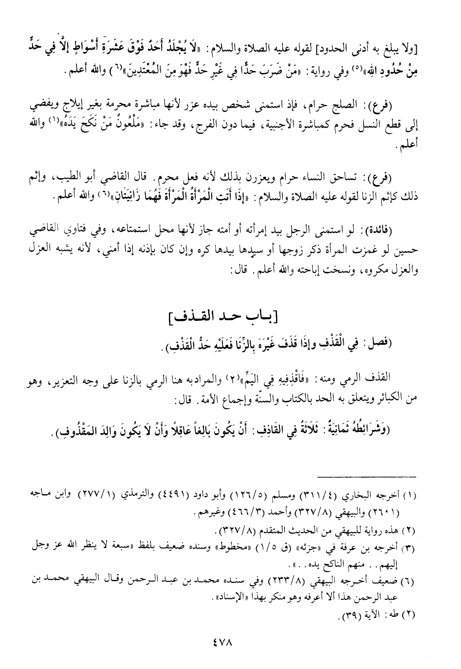(فرع) الصلج حرَام فَإِذا استمنى شخص بِيَدِهِ عزّر لِأَنَّهَا مُبَاشرَة مُحرمَة بِغَيْر إيلاج ويفضي إِلَى قطع النَّسْل فَحرم كمباشرة الْأَجْنَبِيَّة فِيمَا دون الْفرج وَقد جَاءَ مَلْعُون من نكح يَده وَالله أعلم