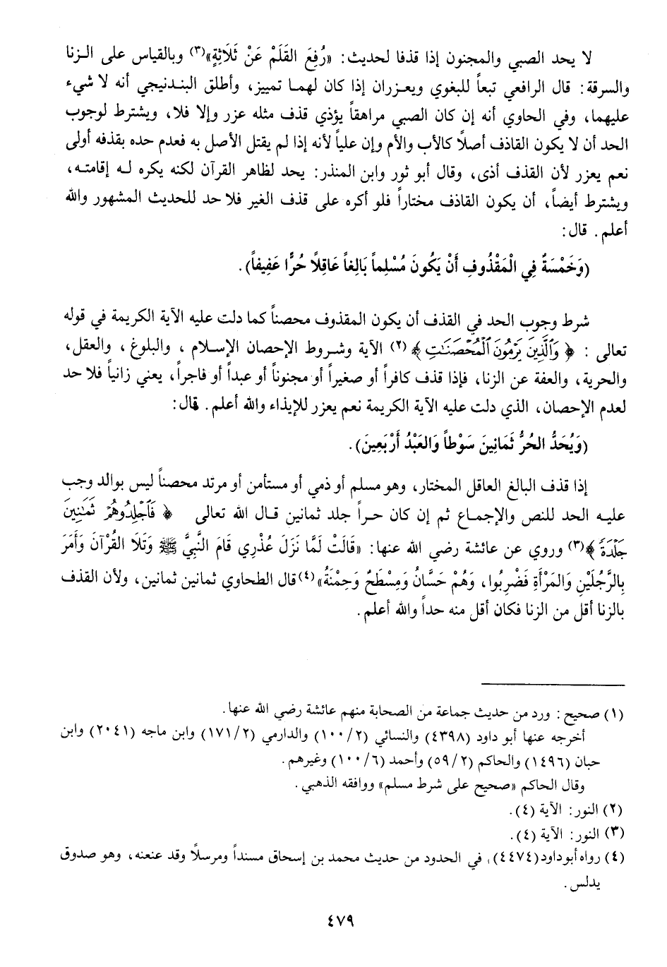 إِذا قذف الْبَالِغ الْعَاقِل الْمُخْتَار وَهُوَ مُسلم أَو ذمِّي أَو مستأمن أَو مُرْتَد مُحصنا لَيْسَ بوالد وَجب عَلَيْهِ الْحَد للنَّص وَالْإِجْمَاع ثمَّ إِن كَانَ حرا جلد ثَمَانِينَ قَالَ الله تَعَالَى {فَاجْلِدُوهُمْ ثَمَانِينَ جلدَة} وَرُوِيَ عَن عَائِشَة رَضِي الله عَنْهَا قَالَت لما نزل عذرى قَامَ النَّبِي صلى الله عَلَيْهِ وَسلم وتلا الْقُرْآن وَأمر بِالرجلَيْنِ وَالْمَرْأَة فَضربُوا وهم حسان ومسطح وَحمْنَة قَالَ الطَّحَاوِيّ ثَمَانِينَ ثَمَانِينَ وَلِأَن الْقَذْف بِالزِّنَا أقل من الزِّنَا فَكَانَ أقل مِنْهُ حدا وَالله أعلم