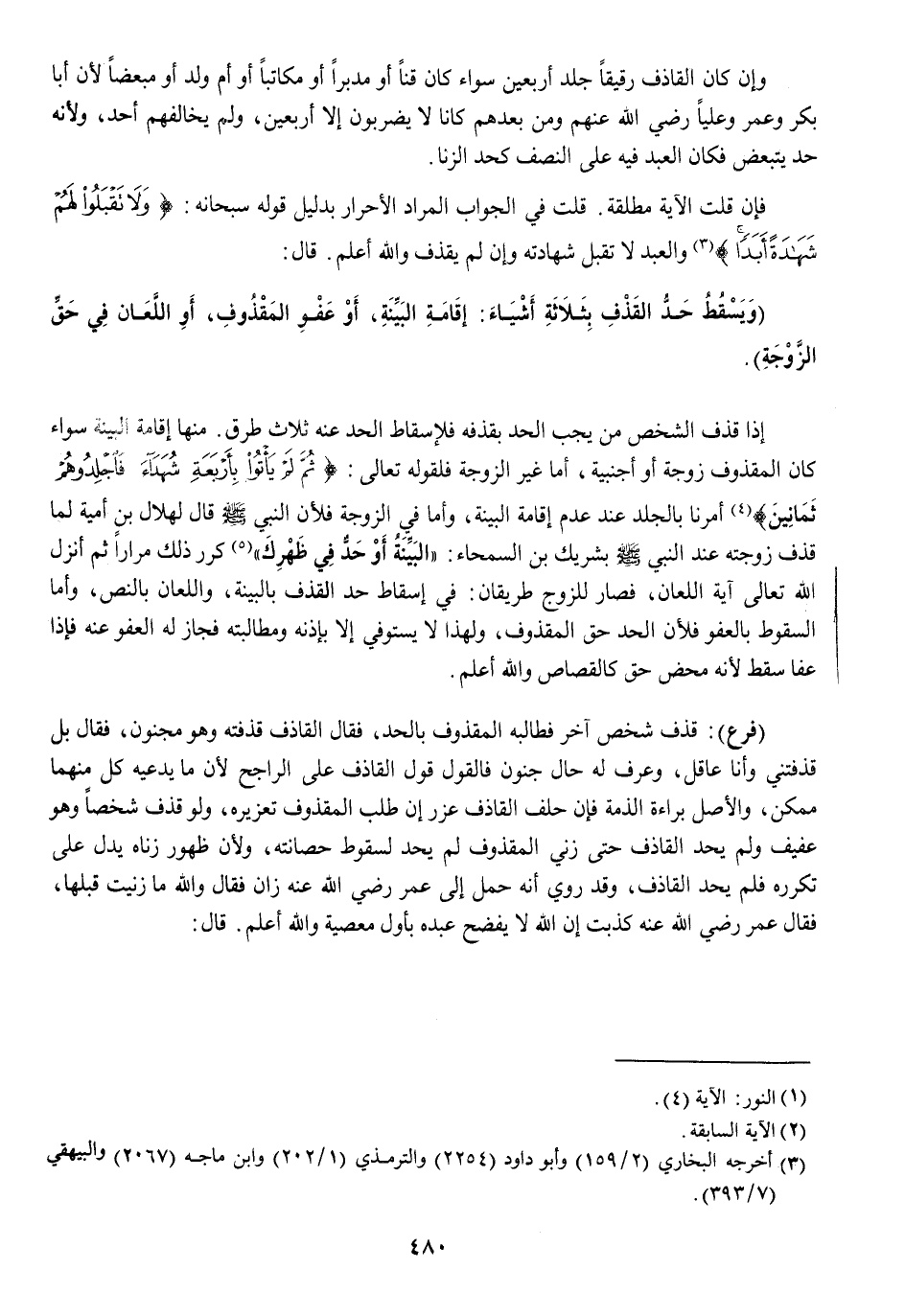 إِذا قذف الشَّخْص من يجب الْحَد بقذفه فلإسقاط الْحَد عَنهُ ثَلَاث طرق مِنْهَا إِقَامَة الْبَيِّنَة سَوَاء كَانَ الْمَقْذُوف زَوْجَة أَو أَجْنَبِيَّة أما غير الزَّوْجَة فَلقَوْله تَعَالَى {ثُمَّ لَمْ يَأْتُوا بأَرْبعَة شُهَدَاء فَاجْلِدُوهُمْ ثَمَانِينَ} أمرنَا بِالْجلدِ عِنْد عدم اقامة الْبَيِّنَة وَأما فِي الزَّوْجَة فَلِأَن النَّبِي صلى الله عَلَيْهِ وَسلم قَالَ لهِلَال بن أُميَّة لما قذف زَوجته عِنْد النَّبِي صلى الله عَلَيْهِ وَسلم بِشريك بن السمحاء الْبَيِّنَة أَو حد فِي ظهرك كرر ذَلِك مرَارًا ثمَّ أنزل الله تَعَالَى آيَة اللّعان فَصَارَ للزَّوْج طَرِيقَانِ فِي اسقاط حد الْقَذْف بِالْبَيِّنَةِ وَاللّعان بِالنَّصِّ وَأما السُّقُوط بِالْعَفو فَلِأَن الْحَد حق الْمَقْذُوف وَلِهَذَا لَا يسْتَوْفى إِلَّا بِإِذْنِهِ ومطالبته فَجَاز لَهُ الْعَفو عَنهُ فَإِذا عَفا سقط لِأَنَّهُ مَحْض حق كَالْقصاصِ وَالله أعلم