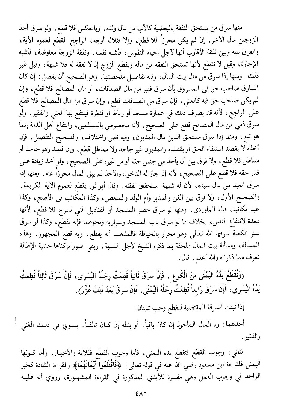 الثَّانِي وجوب الْقطع فتقطع يَده الْيُمْنَى فَأَما وجوب الْقطع فللآية وَالْأَخْبَار وَأما كَونهَا الْيُمْنَى فلقراءة ابْن مَسْعُود رَضِي الله عَنهُ فِي قَوْله تَعَالَى / فَاقْطَعُوا أيمانهما / وَالْقِرَاءَة الشاذة كَخَبَر الْوَاحِد فِي وجوب الْعَمَل وَهِي مفسرة للأيدي الْمَذْكُورَة فِي الْقِرَاءَة الْمَشْهُورَة وَرُوِيَ أَنه عَلَيْهِ