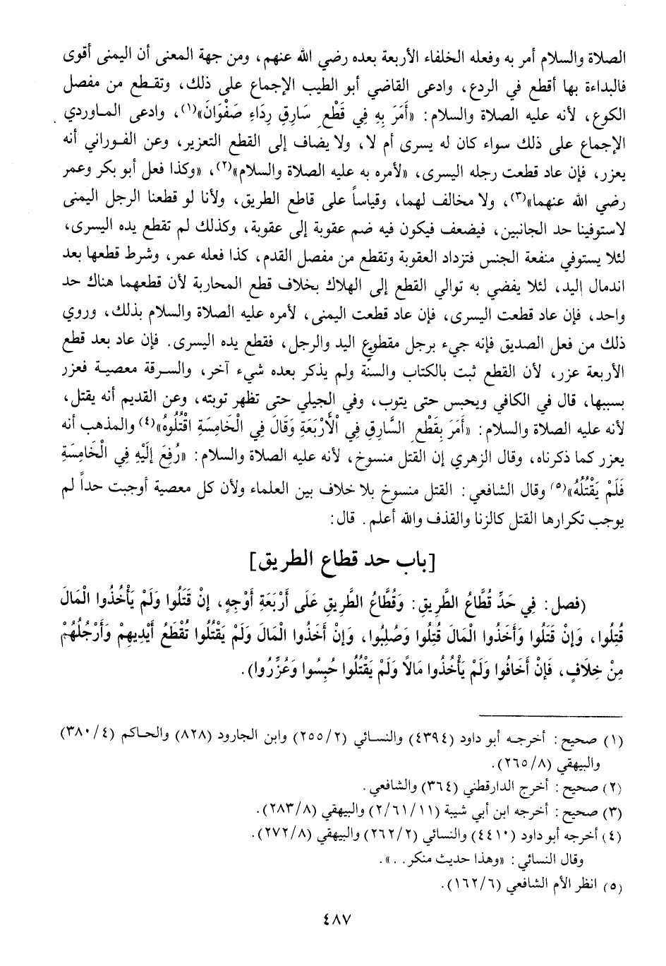 الصَّلَاة وَالسَّلَام أَمر بِهِ وَفعله الْخُلَفَاء الْأَرْبَعَة بعده رَضِي الله عَنْهُم وَمن جِهَة الْمَعْنى أَن الْيُمْنَى أقوى فالبداءة بهَا أقطع فِي الردع وَادّعى القَاضِي أَبُو الطّيب الاجماع على ذَلِك وتقطع من مفصل الْكُوع لِأَنَّهُ عَلَيْهِ الصَّلَاة وَالسَّلَام أَمر بِهِ فِي قطع السَّارِق رِدَاء صَفْوَان وَادّعى الْمَاوَرْدِيّ الاجماع على ذَلِك سَوَاء كَانَ لَهُ يسرى أم لَا وَلَا يُضَاف إِلَى الْقطع التَّعْزِير وَعَن الفوراني أَنه يُعَزّر فَإِن عَاد قطعت رجله الْيُسْرَى لأَمره بِهِ عَلَيْهِ الصَّلَاة وَالسَّلَام وَكَذَا فعل أَبُو بكر وَعمر رَضِي الله عَنْهُمَا وَلَا مُخَالف لَهما وَقِيَاسًا على قَاطع الطَّرِيق ولأنا لَو قَطعنَا الرجل الْيُمْنَى لاستوفينا حد الْجَانِبَيْنِ فيضعف فَيكون فِيهِ ضم عُقُوبَة إِلَى عُقُوبَة وَكَذَلِكَ لم تقطع يَده الْيُسْرَى لِئَلَّا يسْتَوْفى مَنْفَعَة الْجِنْس فتزداد الْعقُوبَة وتقطع من مفصل الْقدَم كَذَا فعله عمر وَشرط قطعهَا بعد اندمال الْيَد لِئَلَّا يُفْضِي بِهِ توالي الْقطع إِلَى الْهَلَاك بِخِلَاف قطع الْمُحَاربَة لِأَن قطعهمَا هُنَاكَ حد وَاحِد فَإِن عَاد قطعت الْيُسْرَى فَإِن عَاد قطعت الْيُمْنَى لأَمره عَلَيْهِ الصَّلَاة وَالسَّلَام بذلك وروى ذَلِك من فعل الصّديق فَإِنَّهُ جِيءَ بِرَجُل مَقْطُوع الْيَد وَالرجل فَقطع يَده الْيُسْرَى فَإِن عَاد بعد قطع الْأَرْبَعَة عزّر لِأَن الْقطع ثَبت بِالْكتاب وَالسّنة وَلم يذكر بعده شَيْء آخر وَالسَّرِقَة مَعْصِيّة فعزر بِسَبَبِهَا قَالَ فِي الْكَافِي وَيحبس حَتَّى يَتُوب وَفِي الجيلي حَتَّى تظهر تَوْبَته وَعَن الْقَدِيم أَنه يقتل لِأَنَّهُ عَلَيْهِ الصَّلَاة وَالسَّلَام أَمر بِقطع السَّارِق فِي الْأَرْبَعَة وَقَالَ فِي الْخَامِسَة اقْتُلُوهُ وَالْمذهب أَنه يُعَزّر كَمَا ذَكرْنَاهُ وَقَالَ الزُّهْرِيّ إِن الْقَتْل مَنْسُوخ لِأَنَّهُ عَلَيْهِ الصَّلَاة وَالسَّلَام رفع إِلَيْهِ فِي الْخَامِسَة فَلم يقْتله وَقَالَ الشَّافِعِي الْقَتْل مَنْسُوخ بِلَا خلاف بَين الْعلمَاء وَلِأَن كل مَعْصِيّة أوجبت حدا لم يُوجب تكرارها الْقَتْل كَالزِّنَا وَالْقَذْف وَالله أعلم قَالَ