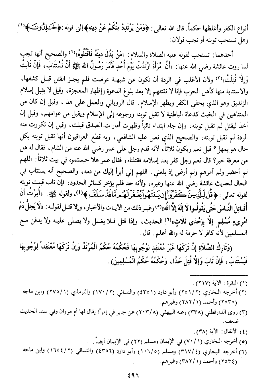 أَنْوَاع الْكفْر وأغلظها حكما قَالَ الله تَعَالَى {وَمَنْ يَرْتَدِدْ مِنْكُمْ عَنْ دِينِهِ} إِلَى قَوْله {خَالِدُونَ} وَهل تسْتَحب تَوْبَته أَو تجب قَولَانِ