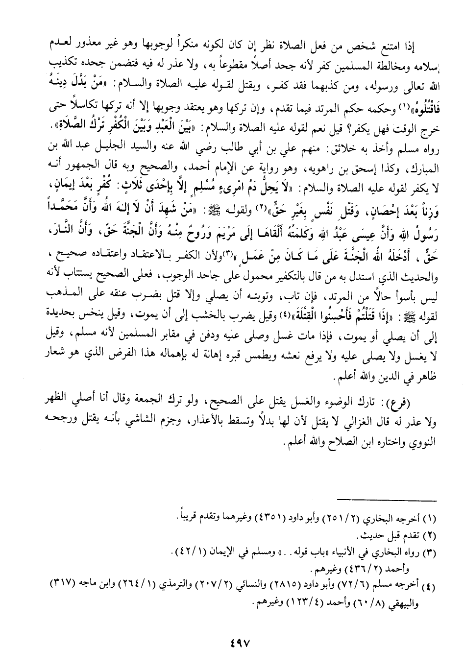 إِذا امْتنع شخص من فعل الصَّلَاة نظر إِن كَانَ لكَونه مُنْكرا لوُجُوبهَا وَهُوَ غير مَعْذُور لعدم إِسْلَامه ومخالطة الْمُسلمين كفر لِأَنَّهُ جحد أصلا مَقْطُوعًا بِهِ وَلَا عذر لَهُ فِيهِ فتضمن جَحده تَكْذِيب الله تَعَالَى وَرَسُوله وَمن كذبهما فقد كفر وَيقتل لقَوْله عَلَيْهِ الصَّلَاة وَالسَّلَام من بدل دينه فَاقْتُلُوهُ وَحكمه حكم الْمُرْتَد فِيمَا تقدم وَإِن تَركهَا وَهُوَ يعْتَقد وُجُوبهَا إِلَّا أَنه تَركهَا تكاسلاً حَتَّى خرج الْوَقْت فَهَل يكفر قيل نعم لقَوْله عَلَيْهِ الصَّلَاة وَالسَّلَام بَين العَبْد وَبَين الْكفْر ترك الصَّلَاة رَوَاهُ مُسلم وَأخذ بِهِ خلائق مِنْهُم عَليّ بن أبي طَالب رَضِي الله عَنهُ وَالسَّيِّد الْجَلِيل عبد الله بن الْمُبَارك وَكَذَا إِسْحَق بن رَاهَوَيْه وَهُوَ رِوَايَة عَن الإِمَام أَحْمد وَالصَّحِيح وَبِه قَالَ الْجُمْهُور أَنه لَا يكفر لقَوْله عَلَيْهِ الصَّلَاة وَالسَّلَام لَا يحل دم امْرِئ مُسلم إِلَّا بِإِحْدَى ثَلَاث كفر بعد إِيمَان وزنا بعد إِحْصَان وَقتل نفس بِغَيْر حق وَلقَوْله صلى الله عَلَيْهِ وَسلم من شهد أَن لَا إِلَه إِلَّا الله وَأَن مُحَمَّدًا رَسُول الله وَأَن عِيسَى عبد الله وكلمته أَلْقَاهَا إِلَى مَرْيَم وروح مِنْهُ وَأَن الْجنَّة حق وَأَن النَّار حق أدخلهُ الله الْجنَّة على مَا كَانَ من عمل وَلِأَن الْكفْر بالاعتقاد واعتقاده صَحِيح والْحَدِيث الَّذِي اسْتدلَّ بِهِ من قَالَ بالتكفير مَحْمُول على جَاحد الْوُجُوب فعلى الصَّحِيح بيستتاب لِأَنَّهُ لَيْسَ بِأَسْوَأ حَالا من الْمُرْتَد فَإِن تَابَ وتوبته أَن يُصَلِّي وَإِلَّا قتل بِضَرْب عُنُقه على الْمَذْهَب لقَوْله صلى الله عَلَيْهِ وَسلم إِذا قتلتم فَأحْسنُوا القتلة وَقيل يضْرب بالخشب إِلَى أَن يَمُوت وَقيل ينخس بحديدة إِلَى أَن يُصَلِّي أَو يَمُوت فَإِذا مَاتَ غسل وَصلي عَلَيْهِ وَدفن فِي مَقَابِر الْمُسلمين لِأَنَّهُ مُسلم وَقيل لَا يغسل وَلَا يصلى عَلَيْهِ وَلَا يرفع نعشه ويطمس قَبره اهانة لَهُ باهماله هَذَا الْفَرْض الَّذِي هُوَ شعار ظَاهر فِي الدّين وَالله أعلم