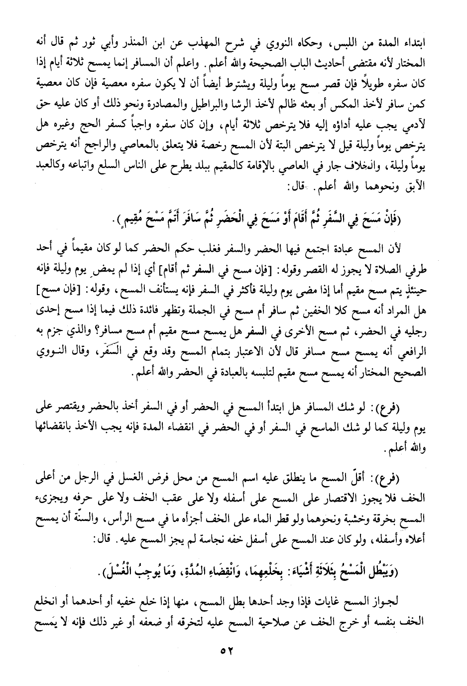 (فرع) لَو شكّ الْمُسَافِر هَل ابْتَدَأَ الْمسْح فِي الْحَضَر أَو فِي السّفر أَخذ بالحضر ويقتصر على يَوْم وَلَيْلَة كَمَا لَو شكّ الماسح فِي السّفر أَو فِي الْحَضَر فِي انْقِضَاء الْمدَّة فَإِنَّهُ يجب الْأَخْذ بانقضائها وَالله أعلم