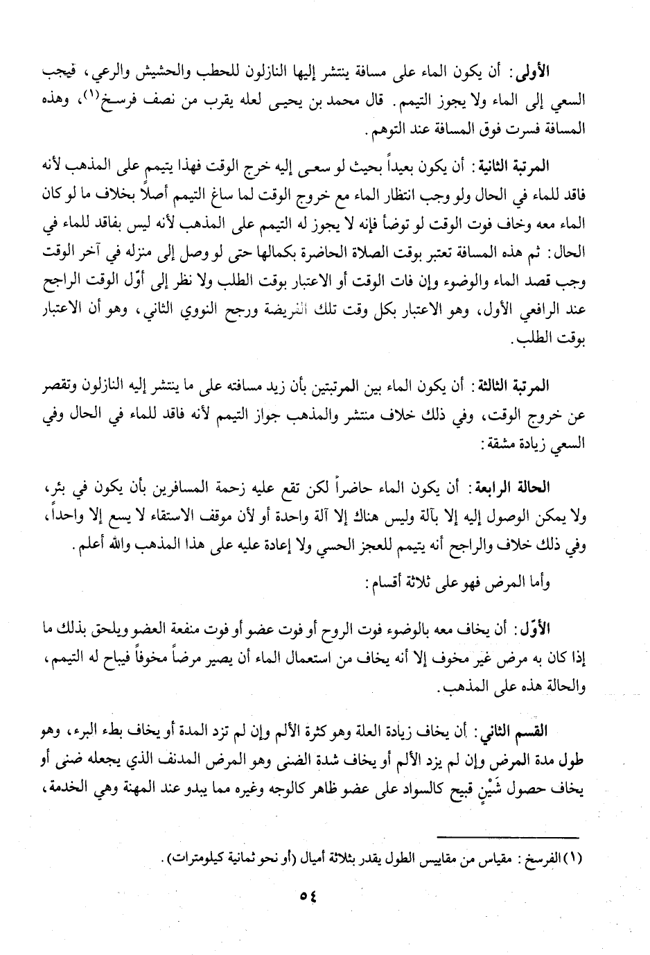 المرنبة الثَّالِثَة أم يكون المَاء بَين المرتبتين بِأَن زيد مسافته على مَا ينتشر إِلَيْهِ النازلون وتقصر عَن خُرُوج الْوَقْت وَفِي ذَلِك خلاف منتشر وَالْمذهب جَوَاز التَّيَمُّم لِأَنَّهُ فَاقِد للْمَاء فِي الْحَال وَفِي السَّعْي زِيَادَة مشقة