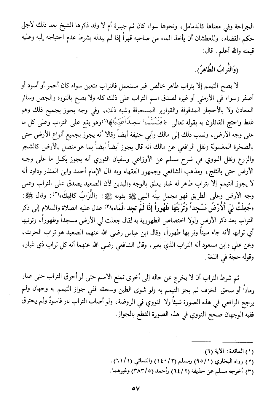 لَا يَصح التَّيَمُّم الا بِتُرَاب طَاهِر خَالص غير مُسْتَعْمل فالتراب مُتَعَيّن سَوَاء كَانَ أَحْمَر أَو اسود أَو أصفر وَسَوَاء فِي الأرمني أَو غَيره لصدق اسْم التُّرَاب على ذَلِك كُله وَلَا يَصح بالنورة والجص وَسَائِر الْمَعَادِن وَلَا بالأحجار المدقوقة والقوارير المسحوقة وَشبه ذَلِك وَفِي وَجه يجوز بِجَمِيعِ ذَلِك وَهُوَ غلط وَاحْتج الْقَائِلُونَ بِهِ بقوله تَعَالَى {فَتَيَمَّمُوا صَعِيدا طيبا} وَهُوَ يَقع على التُّرَاب وعَلى كل مَا على وَجه الأَرْض وَنسب ذَلِك إِلَى مَالك وَأبي حنيفَة أَيْضا وَقَالا إِنَّه يجوز بِجَمِيعِ أَنْوَاع الأَرْض حَتَّى بالصخرة المغسولة وَنقل الرَّافِعِيّ عَن مَالك أَنه قَالَ يجوز أَيْضا أَيْضا بِمَا هُوَ مُتَّصِل بِالْأَرْضِ كالشجر وَالزَّرْع وَنقل النَّوَوِيّ فِي شرح مُسلم عَن الْأَوْزَاعِيّ وسُفْيَان الثَّوْريّ أَنه يجوز بِكُل مَا على وَجه الارض حَتَّى بالثلج وَمذهب الشَّافِعِي وَجُمْهُور الْفُقَهَاء وَبِه قَالَ الإِمَام أَحْمد وَابْن الْمُنْذر وَدَاوُد أَنه لَا يجوز التَّيَمُّم الا بِتُرَاب طَاهِر لَهُ غُبَار يعلق بِالْوَجْهِ وَالْيَدَيْنِ لِأَن الصَّعِيد يصدق على التُّرَاب وعَلى وَجه الأَرْض وعَلى الطَّرِيق فَهُوَ مُجمل بَينه النَّبِي صلى الله عَلَيْهِ وَسلم بقوله صلى الله عَلَيْهِ وَسلم