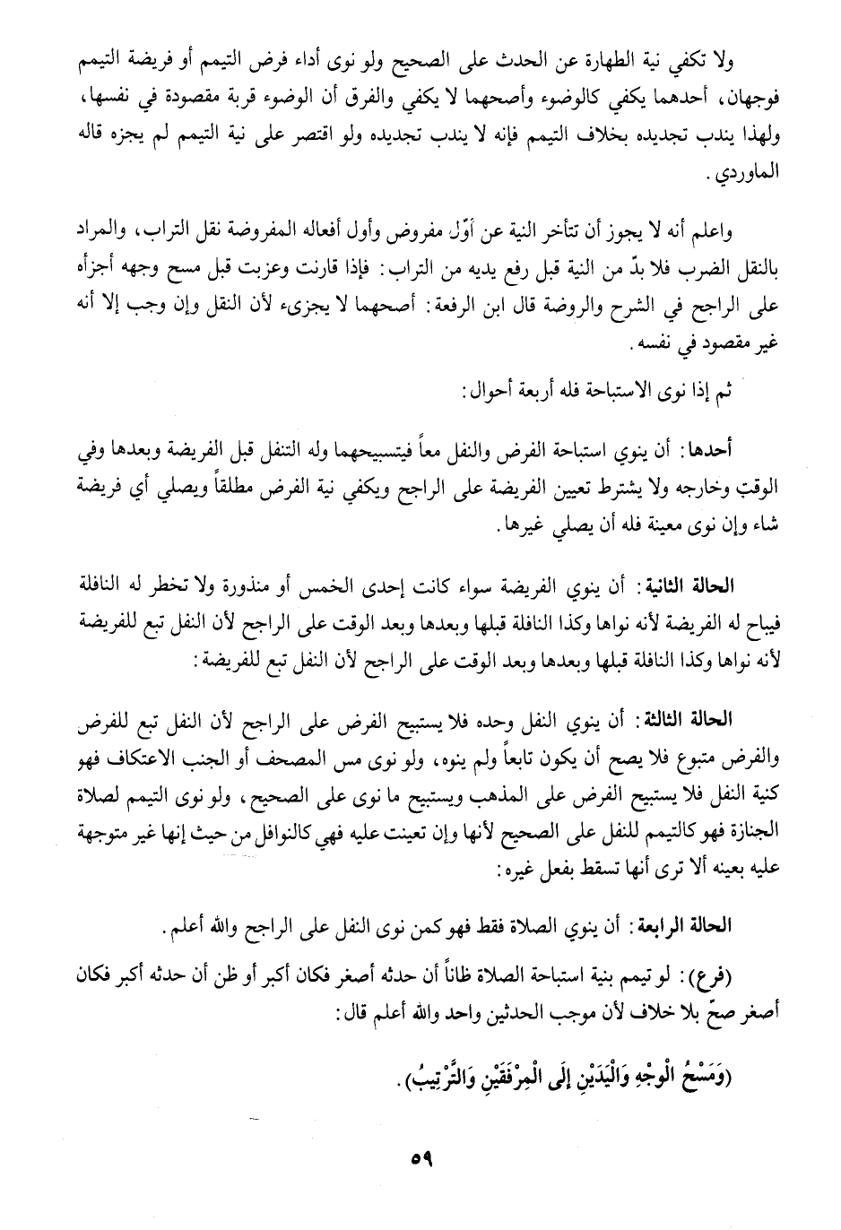 الْحَالة الثَّالِثَة أَن يَنْوِي النَّفْل وَحده فَلَا يستبيح الْفَرْض على الرَّاجِح لَان النَّفْل تبع للْفَرض وَالْفَرْض متبوع فَلَا يَصح أَن يكون تَابعا وَلم يُنَوّه وَلَو نوى مس الْمُصحف أَو الْجنب الِاعْتِكَاف فَهُوَ كنية النَّفْل فَلَا يستبيح الْفَرْض على الْمَذْهَب ويستبيح مَا نوى على الصَّحِيح وَلَو نوى التَّيَمُّم لصَلَاة الْجِنَازَة فَهُوَ كالتيمم للنفل على الصَّحِيح لِأَنَّهَا وان تعيّنت عَلَيْهِ فَهِيَ كالنوافل من حَيْثُ انها غير متوجهة عَلَيْهِ بِعَيْنِه أَلا ترى أَنَّهَا تسْقط بِفعل غَيره