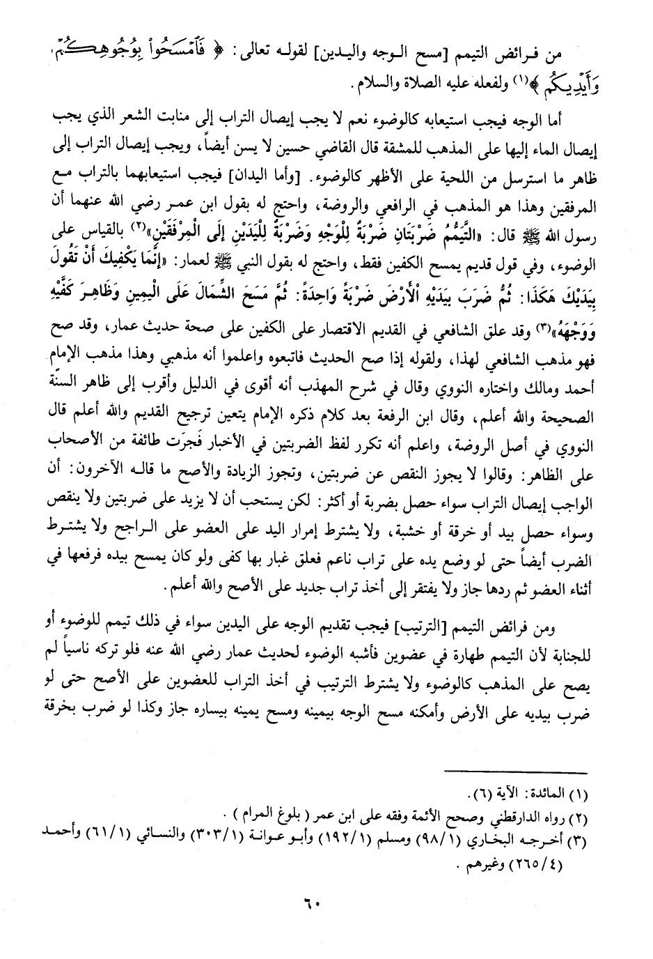 (إِنَّمَا يَكْفِيك أَن تَقول بيديك هَكَذَا ثمَّ ضرب بيدَيْهِ الأَرْض ضَرْبَة وَاحِدَة ثمَّ مسح الشمَال على الْيَمين وَظَاهر كفيه وَوَجهه) وَقد علق الشَّافِعِي فِي الْقَدِيم الِاقْتِصَار على الْكَفَّيْنِ على صِحَة حَدِيث عمار وَقد صَحَّ فَهُوَ مَذْهَب الشَّافِعِي لهَذَا وَلقَوْله إِذا صَحَّ الحَدِيث فَاتَّبعُوهُ وَاعْلَمُوا أَنه مذهبي وَهَذَا مَذْهَب الامام أَحْمد وَمَالك وَاخْتَارَهُ النَّوَوِيّ وَقَالَ فِي شرح الْمُهَذّب انه أقوى فِي الدَّلِيل وَأقرب إِلَى ظَاهر السّنة الصَّحِيحَة وَالله أعلم وَقَالَ ابْن الرّفْعَة بعد كَلَام ذكره الامام يتَعَيَّن تَرْجِيح الْقَدِيم وَالله أعلم قَالَ النَّوَوِيّ فِي أصل الرَّوْضَة وَاعْلَم أَنه تكَرر لفظ الضربتين فِي الْأَخْبَار فجرت طَائِفَة من الْأَصْحَاب على الظَّاهِر وَقَالُوا لَا يجوز النَّقْص عَن ضربتين وَتجوز الزِّيَادَة وَالأَصَح مَا قَالَه الْآخرُونَ ان الْوَاجِب إِيصَال التُّرَاب سَوَاء حصل ضَرْبَة أَو أَكثر لَكِن يسْتَحبّ أَن لايزيد على ضربتين وَلَا ينقص وَسَوَاء حصل بيد أَو خرقَة أَو خَشَبَة وَلَا يشْتَرط امرار الْيَد على الْعُضْو على الرَّاجِح وَلَا يشْتَرط الضَّرْب أَيْضا حَتَّى لَو وضع يَده على تُرَاب ناعم فعلق غُبَار بهَا كفى وَلَو كَانَ يمسح بِيَدِهِ فَرَفعهَا فِي أثْنَاء الْعُضْو ثمَّ ردهَا جَازَ وَلَا يفْتَقر إِلَى أَخذ تُرَاب جَدِيد على الْأَصَح وَالله أعلم