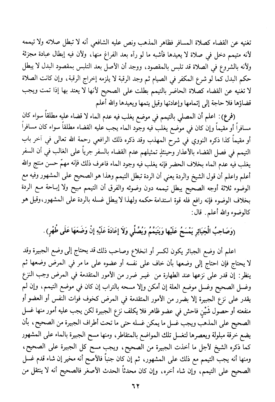 (فرع) اعْلَم أَن الْمُصَلِّي بِالتَّيَمُّمِ فِي مَوضِع يغلب فِيهِ عدم المَاء لَا قَضَاء عَلَيْهِ مُطلقًا سَوَاء كَانَ مُسَافِرًا أَو مُقيما وَإِن كَانَ فِي مَوضِع يغلب فِيهِ وجود المَاء يجب عَلَيْهِ الْقَضَاء مُطلقًا سَوَاء كَانَ مُسَافِرًا أَو مُقيما كَذَا ذكره النَّوَوِيّ فِي شرح الْمُهَذّب وَقد ذكره ذَلِك الرَّافِعِيّ رَحمَه الله تَعَالَى فِي آخر بَاب التَّيَمُّم فِي فصل الْقَضَاء بالأعذار وَحِينَئِذٍ تمثيلهم عدم الْقَضَاء بِالسَّفرِ جَريا على الْغَالِب فِي أَن السّفر يغلب فِيهِ عدم المَاء بِخِلَاف الْحَضَر فَإِنَّهُ يغلب فِيهِ وجود المَاء فاعرف ذَلِك فَإِنَّهُ مُهِمّ حسن منتج وَالله أعلم وَاعْلَم أَن قَول الشَّيْخ وَالرِّدَّة يَعْنِي أَن الرِّدَّة تبطل التَّيَمُّم وَهَذَا هُوَ الصَّحِيح على الْمَشْهُور وَفِيه مَعَ الْوضُوء ثَلَاثَة أوجه الصَّحِيح يبطل تيَمّمه دون وضوئِهِ وَالْفرق أَن التَّيَمُّم مُبِيح وَلَا إِبَاحَة مَعَ الرِّدَّة بِخِلَاف الْوضُوء فَإِنَّهُ رَافع فَلهُ قُوَّة اسْتِدَامَة حكمه وَلِهَذَا لَا يبطل غسله بِالرّدَّةِ على الْمَشْهُور وَقيل هُوَ كَالْوضُوءِ وَالله أعلم