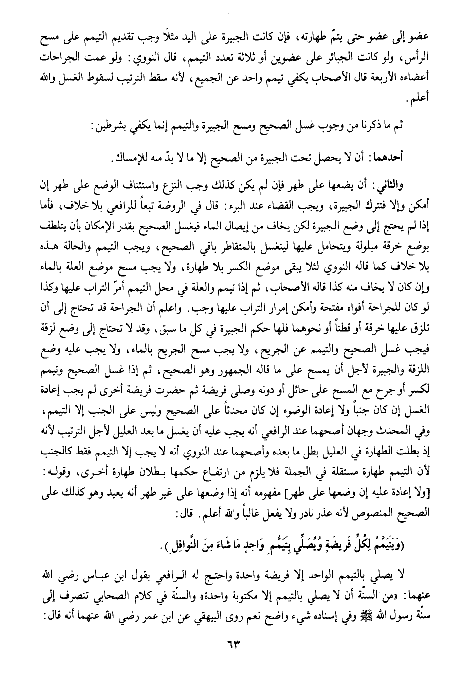 وَالثَّانِي أَن يَضَعهَا على طهر فَإِن لم يكن كَذَلِك وَجب النَّوْع واستئناف الْوَضع على طهر إِن أمكن وَإِلَّا فَتتْرك الْجَبِيرَة وَيجب الْقَضَاء عِنْد الْبُرْء قَالَ فِي الرَّوْضَة تبعا للرافعي بِلَا خلاف فَأَما إِذا لم يحْتَج إِلَى وضع الْجَبِيرَة لَكِن يخَاف من إِيصَال المَاء فَيغسل الصَّحِيح بِقدر الْإِمْكَان بِأَن يتلطف بِوَضْع خرقَة مبلولة ويتحامل عَلَيْهَا لينغسل بالمتقاطر بَاقِي الصَّحِيح وَيجب التَّيَمُّم وَالْحَالة هَذِه بِلَا خلاف كَمَا قَالَه النَّوَوِيّ لِئَلَّا يبْقى مَوضِع الْكسر بِلَا طَهَارَة وَلَا يجب مسح مَوضِع الْعلَّة بِالْمَاءِ وَإِن كَانَ لَا يخَاف مِنْهُ كَذَا قَالَه الْأَصْحَاب ثمَّ إِذا تيَمّم وَالْعلَّة فِي مَحل التَّيَمُّم أَمر التُّرَاب عَلَيْهَا وَكَذَا لَو كَانَ للجراحة أَفْوَاه مفتحة وَأمكن إمرار التُّرَاب عَلَيْهَا وَجب وَاعْلَم أَن الْجراحَة قد تحْتَاج إِلَى أَن تلزق عَلَيْهَا خرقَة أَو قطناً أَو نَحْوهمَا فلهَا حكم الْجَبِيرَة فِي كل مَا سبق وَقد لَا تحْتَاج إِلَى وضع لزقة فَيجب غسل الصَّحِيح وَالتَّيَمُّم عَن الجريح وَلَا يجب مسح الجريح بِالْمَاءِ وَلَا يجب عَلَيْهِ وضع اللزقة والجبيرة لأجل أَن يمسح على مَا قَالَه الْجُمْهُور وَهُوَ الصَّحِيح ثمَّ إِذا غسل الصَّحِيح وَتيَمّم لكسر أَو جرح مَعَ الْمسْح على حَائِل أَو دونه وَصلى فَرِيضَة ثمَّ حضرت فَرِيضَة أُخْرَى لم يجب إِعَادَة الْغسْل إِن كَانَ جنبا وَلَا إِعَادَة الْوضُوء إِن كَانَ مُحدثا على الصَّحِيح وَلَيْسَ على الْجنب إِلَّا التَّيَمُّم وَفِي الْمُحدث وَجْهَان أصَحهمَا عِنْد الرَّافِعِيّ أَنه يجب عَلَيْهِ أَن يغسل مَا بعد العليل لأجل التَّرْتِيب لِأَنَّهُ إِذْ بطلت الطَّهَارَة فِي العليل بَطل مَا بعده وأصحهما عِنْد النَّوَوِيّ أَنه يجب إِلَّا التَّيَمُّم فَقَط كالجنب لِأَن التَّيَمُّم طَهَارَة مُسْتَقلَّة فِي الْجُمْلَة فَلَا يلْزم من ارْتِفَاع حكمهَا بطلَان طَهَارَة أُخْرَى وَقَوله وَلَا إِعَادَة عَلَيْهِ إِن وَضعهَا على طهر مَفْهُومه أَنه إِذا وَضعهَا على غير طهر أَنه يُعِيد وَهُوَ كَذَلِك على الصَّحِيح الْمَنْصُوص لِأَنَّهُ عذر نَادِر وَلَا يفعل غَالِبا وَالله أعلم قَالَ