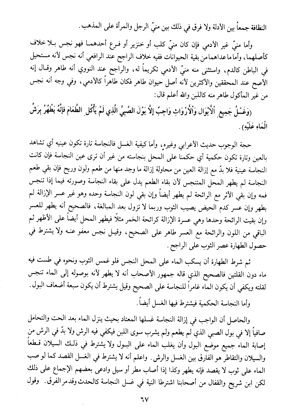النَّظَافَة جمعا بَين الْأَدِلَّة وَلَا فرق فِي ذَلِك بَين مني الرجل وَالْمَرْأَة على الْمَذْهَب