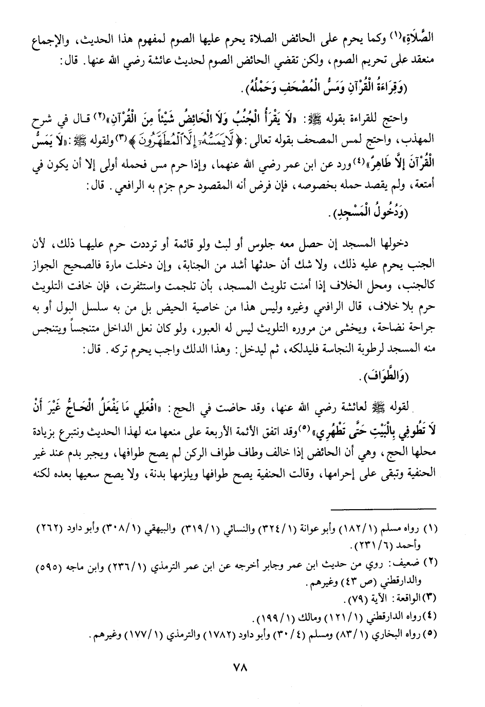 (افعلي مَا يفعل الْحَاج غير أَن لَا تطوفي بِالْبَيْتِ حَتَّى تطهري) وَقد اتّفق الْأَئِمَّة الْأَرْبَعَة على منعهَا مِنْهُ لهَذَا الحَدِيث ونتبرع بِزِيَادَة محلهَا الْحَج وَهِي أَن الْحَائِض إِذا خَالف وَطَاف طواف الرُّكْن لم يَصح طوافها وَيجْبر بِدَم عِنْد غير الْحَنَفِيَّة وَتبقى على إحرامها وَقَالَت الْحَنَفِيَّة يَصح طوافها ويلزمها بَدَنَة وَلَا يص سعيها بعده لكنه