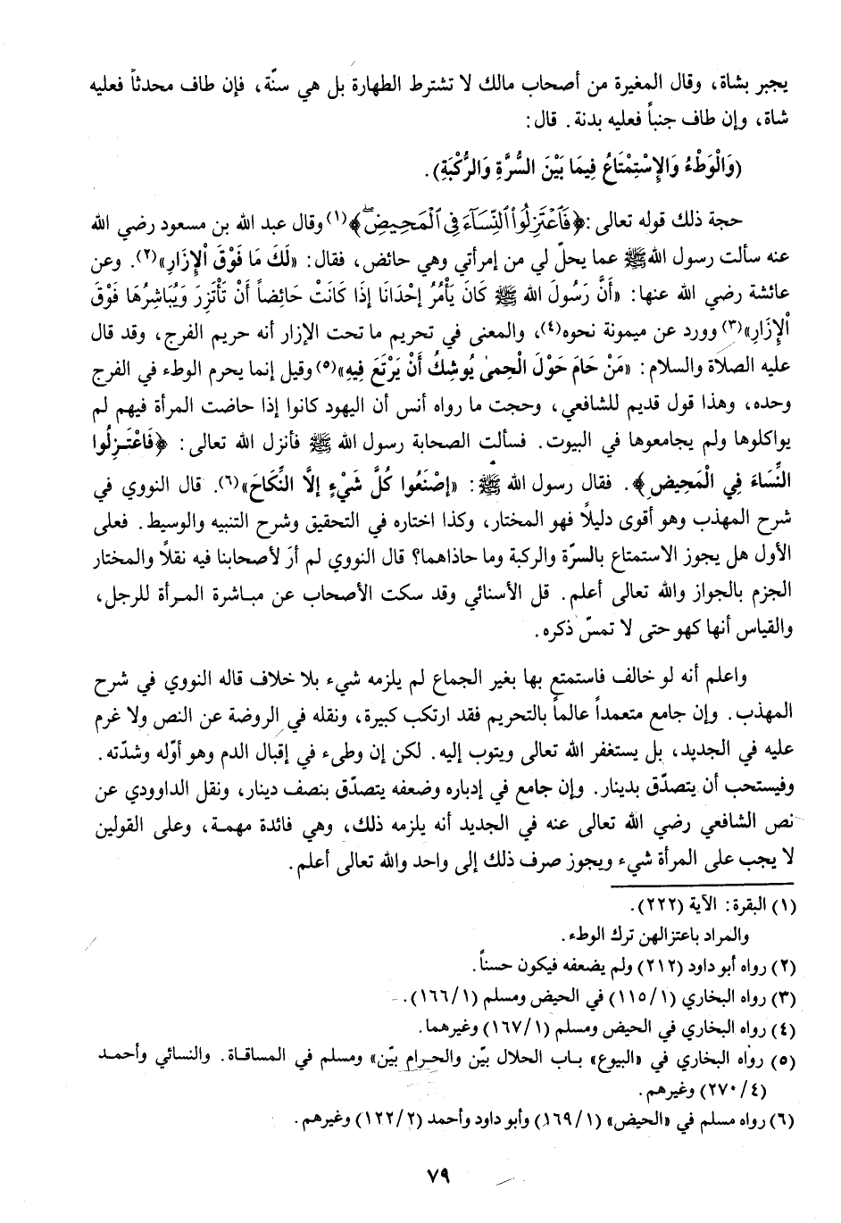 (أَن رَسُول الله صلى الله عَلَيْهِ وَسلم كَانَ يَأْمر إحدانا إِذا كَانَت حَائِضًا أَن تأتزر ويباشرها فَوق الْإِزَار) وَورد عَن مَيْمُونَة نَحوه وَالْمعْنَى فِي تَحْرِيم مَا تَحت الازار أَنه حَرِيم الْفرج وَقد قَالَ عَلَيْهِ الصَّلَاة وَالسَّلَام