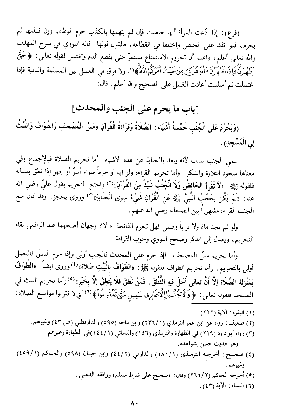 (لَا تقْرَأ الْحَائِض وَلَا الْجنب شَيْئا من الْقُرْآن) وَاحْتج للتَّحْرِيم بقول عَليّ رَضِي الله عَنهُ