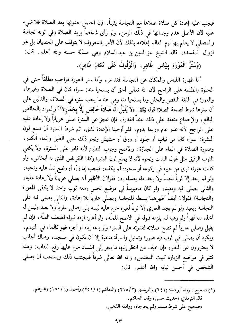 (لَا يقبل الله صَلَاة حَائِض إِلَّا بخمار) وَالْمرَاد بالحائض الْبَالِغ وَالْإِجْمَاع مُنْعَقد على ذَلِك عِنْد الْقُدْرَة فَإِن عجز عَن الستْرَة صلى عُريَانا وَلَا إِعَادَة عَلَيْهِ على الرَّاجِح لِأَنَّهُ عذر عَام وَرُبمَا يَدُوم فَلَو أَوجَبْنَا الْإِعَادَة لشق ثمَّ شَرط الستْرَة أَن تمنع لون الْبشرَة سَوَاء كَانَ من ثِيَاب أَو جُلُود أَو ورق أَو حشيش وَنَحْو ذَلِك حَتَّى الطين وَالْمَاء الكدر وَصُورَة الصَّلَاة فِي المَاء على الْجِنَازَة وَالأَصَح وجوب التطين لِأَنَّهُ قَادر على الستْرَة وَلَا يَكْفِي الثَّوْب الرَّقِيق مثل غزل الْبَنَات وَنَحْوه لِأَنَّهُ لَا يمْنَع لون الْبشرَة وَكَذَا الكرباس الَّذِي لَهُ أبخاش وَلَو كَانَت عَوْرَته ترى من جيبه فِي رُكُوعه أَو سُجُوده لم يكف فَيجب إِمَّا زره أَو وضع شدّ عَلَيْهِ وَنَحْوه وَلَو لم يجد إِلَّا ثوبا نجسا وَلَا يجد مَاء يغسلهُ بِهِ فَقَوْلَانِ الْأَظْهر أَنه يُصَلِّي عُريَانا وَلَا إِعَادَة عَلَيْهِ وَالثَّانِي يُصَلِّي فِيهِ وَيُعِيد وَلَو كَانَ مَحْبُوسًا فِي مَوضِع نجس وَمَعَهُ ثوب وَاحِد لَا يَكْفِي للعورة والنجاسة فَقَوْلَانِ أَيْضا أظهرهمَا يبسطه للنَّجَاسَة وَيُصلي عَارِيا بِلَا إِعَادَة وَالثَّانِي يُصَلِّي فِيهِ على النَّجَاسَة وَيُعِيد وَلَو لم يجد العاري إِلَّا ثوبا لغيره حرم عَلَيْهِ لبسه بلَى يُصَلِّي عَارِيا وَلَا يُعِيد وَلَيْسَ لَهُ أَخذه مِنْهُ قهرا وَلَو وهبه لم يلْزمه قبُوله فِي الْأَصَح للمنة وَلَو أَعَارَهُ لزمَه قبُوله لضعف الْمِنَّة فَإِن لم يقبل وَصلى عَارِيا لم تصح صلَاته لقدرته على الستْرَة وَلَو بَاعه إِيَّاه أَو أجره فَهُوَ كَالْمَاءِ فِي التَّيَمُّم وَيكرهُ أَن يُصَلِّي فِي ثوب فِيهِ صُورَة وتمثيل وَالْمَرْأَة متنقبة إِلَّا أَن تكون فِي مَسْجِد وَهُنَاكَ أجانب لَا يحترزون عَن النّظر فَإِن خيف من النّظر إِلَيْهَا مَا يجر إِلَى الْفساد حرم عَلَيْهَا رفع النقاب وَهَذَا كثير فِي مَوَاضِع الزِّيَارَة كبيت الْمُقَدّس زَاده الله تَعَالَى شرفاً فليجتنب ذَلِك وَيسْتَحب أَن يُصَلِّي الشَّخْص فِي أحسن ثِيَابه وَالله أعلم قَالَ