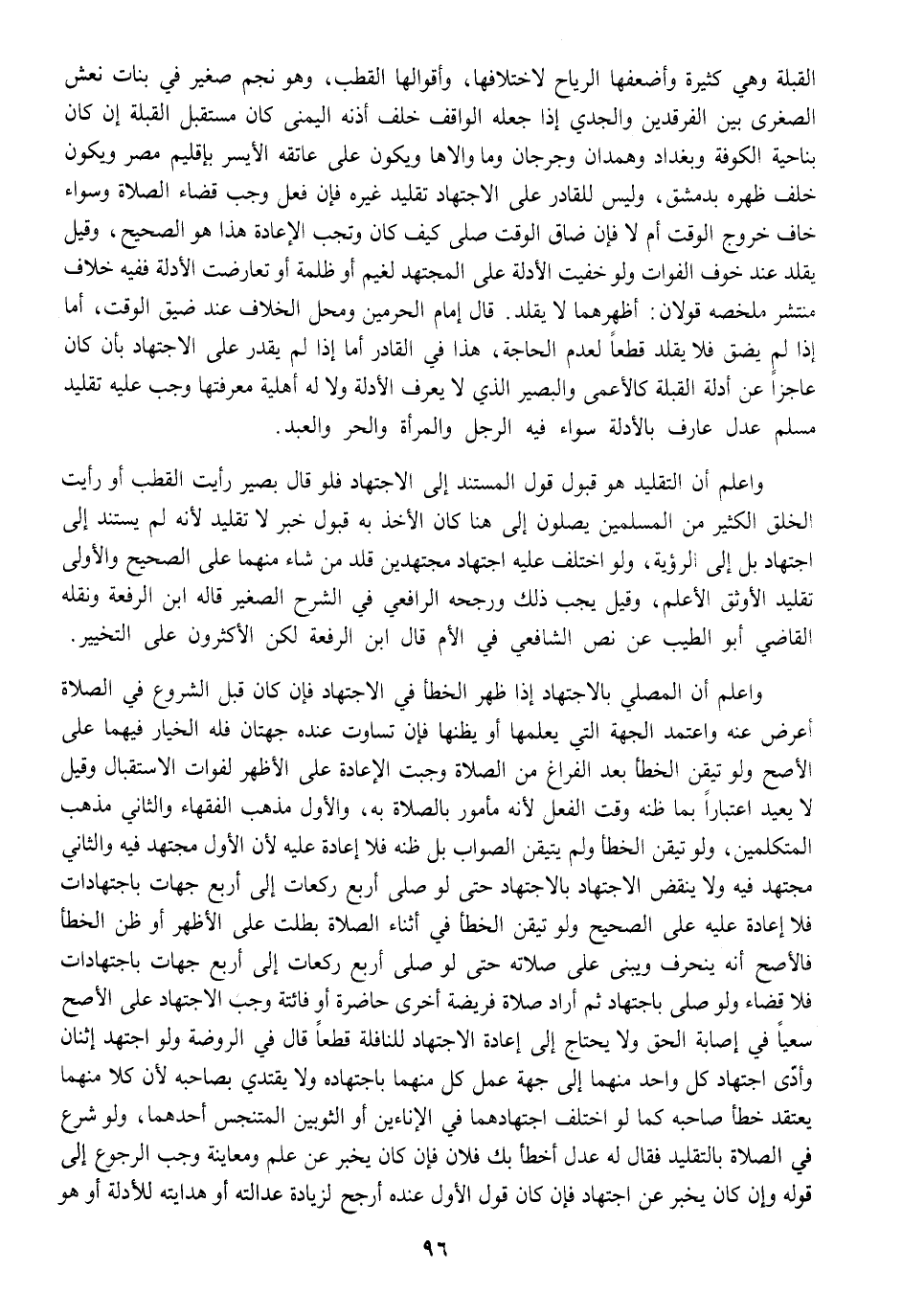الْقبْلَة وَهِي كَثِيرَة وأضعفها الرِّيَاح لاختلافها وأقوالها القطب وَهُوَ نجم صَغِير فِي بَنَات نعش الصُّغْرَى بَين الفرقدين والجدي إِذا جعله الْوَاقِف خلف أُذُنه الْيُمْنَى كَانَ مُسْتَقْبل الْقبْلَة إِن كَانَ بِنَاحِيَة الْكُوفَة وبغداد وهمدان وجرجان وَمَا والاها وَيكون على عَاتِقه الْأَيْسَر بأقليم مصر وَيكون خلف ظَهره بِدِمَشْق وَلَيْسَ للقادر على الإجتهاد تَقْلِيد غَيره فَإِن فعل وَجب قَضَاء الصَّلَاة وَسَوَاء خَافَ خُرُوج الْوَقْت أم لَا فَإِن ضَاقَ الْوَقْت صلى كَيفَ كَانَ وَتجب الْإِعَادَة هَذَا هُوَ الصَّحِيح وَقيل يُقَلّد عِنْد خوف الْفَوات وَلَو خفيت الْأَدِلَّة على الْمُجْتَهد لغيم أَو ظلمَة أَو تَعَارَضَت الْأَدِلَّة فَفِيهِ خلاف منتشر ملخصه قَولَانِ أظهرهمَا لَا يُقَلّد قَالَ إِمَام الْحَرَمَيْنِ وَمحل الْخلاف عِنْد ضيق الْوَقْت أما إِذا لم يضق فَلَا يُقَلّد قطعا لعدم الْحَاجة هَذَا فِي الْقَادِر أما إِذا لم يقدر على الِاجْتِهَاد بِأَن كَانَ عَاجِزا عَن أَدِلَّة الْقبْلَة كالأعمى والبصير الَّذِي لَا يعرف الْأَدِلَّة وَلَا لَهُ أَهْلِيَّة مَعْرفَتهَا وَجب عَلَيْهِ تَقْلِيد مُسلم عدل عَارِف بالأدلة سَوَاء فِيهِ الرجل وَالْمَرْأَة وَالْحر وَالْعَبْد