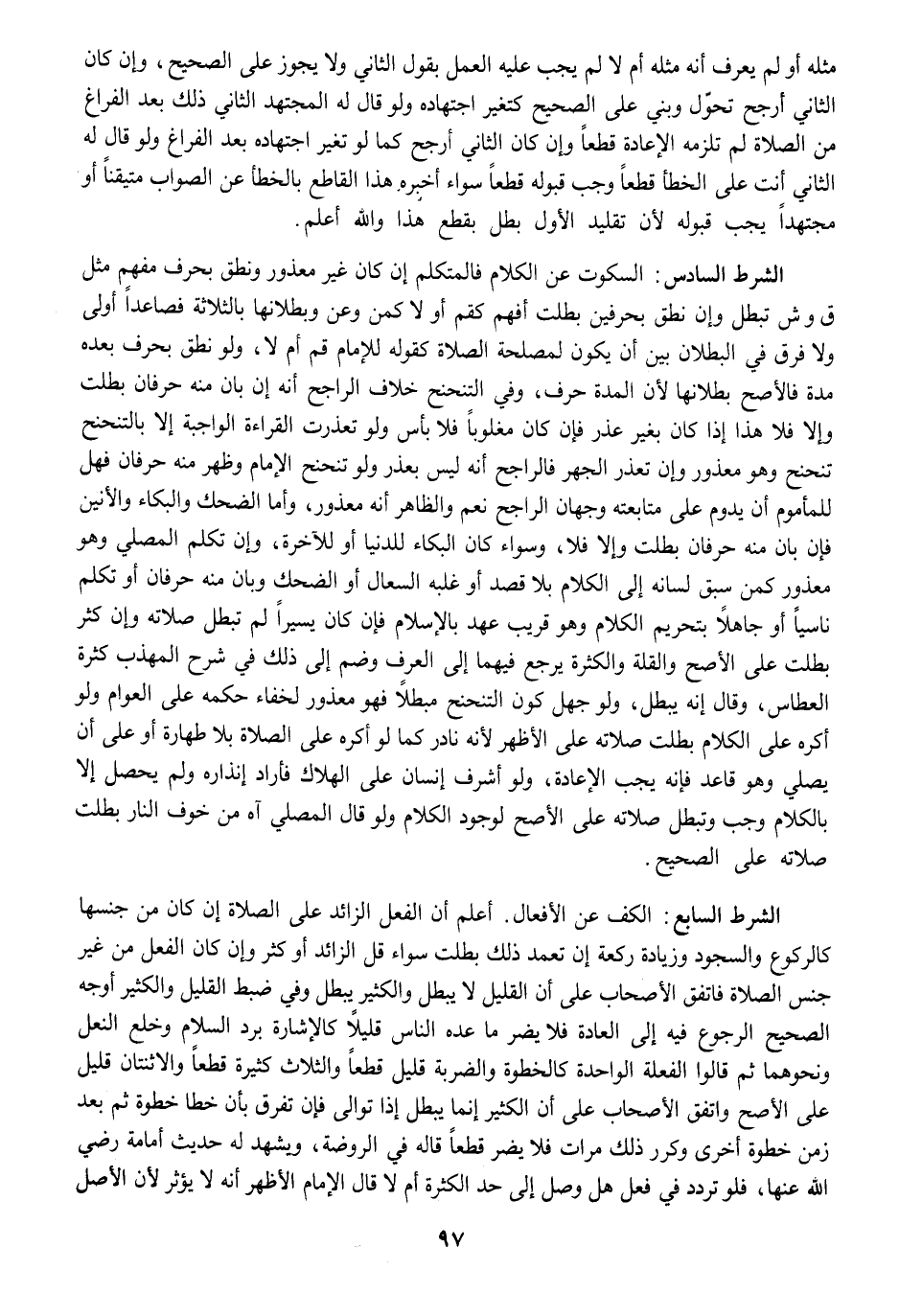 الشَّرْط السَّادِس السُّكُوت عَن الْكَلَام فالمتكلم إِن كَانَ غير مَعْذُور ونطق بِحرف مفهم مثل ق وش تبطل وَإِن نطق بحرفين بطلت أفهم كقم أَو لَا كمن وَعَن وبطلانها بِالثَّلَاثَةِ فَصَاعِدا أولى وَلَا فرق فِي الْبطلَان بَين أَن يكون لمصْلحَة الصَّلَاة كَقَوْلِه للْإِمَام قُم أم لَا وَلَو نطق بِحرف بعده مُدَّة فَالْأَصَحّ بُطْلَانهَا لِأَن الْمدَّة حرف وَفِي التنحنح خلاف الرَّاجِح أَنه إِن بَان مِنْهُ حرفان بطلت وَإِلَّا فَلَا هَذَا إِذا كَانَ بِغَيْر عذر فَإِن كَانَ مَغْلُوبًا فَلَا بَأْس وَلَو تَعَذَّرَتْ الْقِرَاءَة الْوَاجِبَة إِلَّا بالتنحنح تنحنح وَهُوَ مَعْذُور وَإِن تعذر الْجَهْر فالراجح أَنه لَيْسَ بِعُذْر وَلَو تنحنح الامام وَظهر مِنْهُ حرفان فَهَل للْمَأْمُوم أَن يَدُوم على مُتَابَعَته وَجْهَان الرَّاجِح نعم وَالظَّاهِر أَنه مَعْذُور وَأما الضحك والبكاء والأنين فَإِن بَان مِنْهُ حرفان بطلت وَإِلَّا فَلَا وَسَوَاء كَانَ الْبكاء للدنيا أَو للآخررة وَإِن تكلم الْمُصَلِّي وَهُوَ مَعْذُور كمن سبق لِسَانه إِلَى الْكَلَام بِلَا قصد أَو غَلبه السعال أَو الضحك وَبَان مِنْهُ حرفان أَو تكلم نَاسِيا أَو جَاهِلا بِتَحْرِيم الْكَلَام وَهُوَ قريب عهد بِالْإِسْلَامِ فَإِن كَانَ يَسِيرا لم تبطل صلَاته وَإِن كثر بطلت على الْأَصَح والقلة وَالْكَثْرَة يرجع فيهمَا إِلَى الْعرف وَضم إِلَى ذَلِك فِي شرح الْمُهَذّب كَثْرَة العطاس وَقَالَ إِنَّه يبطل وَلَو جهل كَون التنحنح مُبْطلًا فَهُوَ مَعْذُور لخفاء حكمه على الْعَوام وَلَو أكره على الْكَلَام بطلت صلَاته على الْأَظْهر لِأَنَّهُ نَادِر كَمَا لَو أكره على الصَّلَاة بِلَا طَهَارَة أَو على أَن يُصَلِّي وَهُوَ قَاعد فَإِنَّهُ يجب الاعادة وَلَو أشرف إِنْسَان على الْهَلَاك فَأَرَادَ انذاره وَلم يحصل إِلَّا بالْكلَام وَجب وَتبطل صلَاته على الْأَصَح لوُجُود الْكَلَام وَلَو قَالَ الْمُصَلِّي آه من خوف النَّار بطلت صلَاته على الصَّحِيح