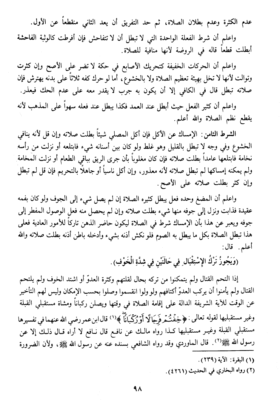 إِذا التحم الْقِتَال وَلم يتمكنوا من تَركه بِحَال لقلتهم وَكَثْرَة الْعَدو أَو اشْتَدَّ الْخَوْف وَلم يلتحم الْقِتَال وَلم يأمنوا أَن يركب الْعَدو أكتافهم وَلَو ولوا انقسموا وصلوا بِحَسب الامكان وَلَيْسَ لَهُم التَّأْخِير عَن الْوَقْت لِلْآيَةِ الشَّرِيفَة الدَّالَّة على إِقَامَة الصَّلَاة فِي وَقتهَا ويصلن ركباناً وَمُشَاة مستقبلي الْقبْلَة وَغير مستقبليها لقَوْله تَعَالَى {خِفْتُمْ فرجالاً أَو ركباناً} قَالَ ابْن عمر رَضِي الله عَنْهُمَا فِي تَفْسِيرهَا مستقبلي الْقبْلَة وَغير مستقبليها كَذَا رَوَاهُ مَالك عَن نَافِع قَالَ نَافِع لَا أرَاهُ قَالَ ذَلِك إِلَّا عَن رَسُول الله صلى الله عَلَيْهِ وَسلم قَالَ الْمَاوَرْدِيّ وَقد رَوَاهُ الشَّافِعِي بِسَنَدِهِ عَنهُ عَن رَسُول الله صلى الله عَلَيْهِ وَسلم وَلِأَن الضَّرُورَة