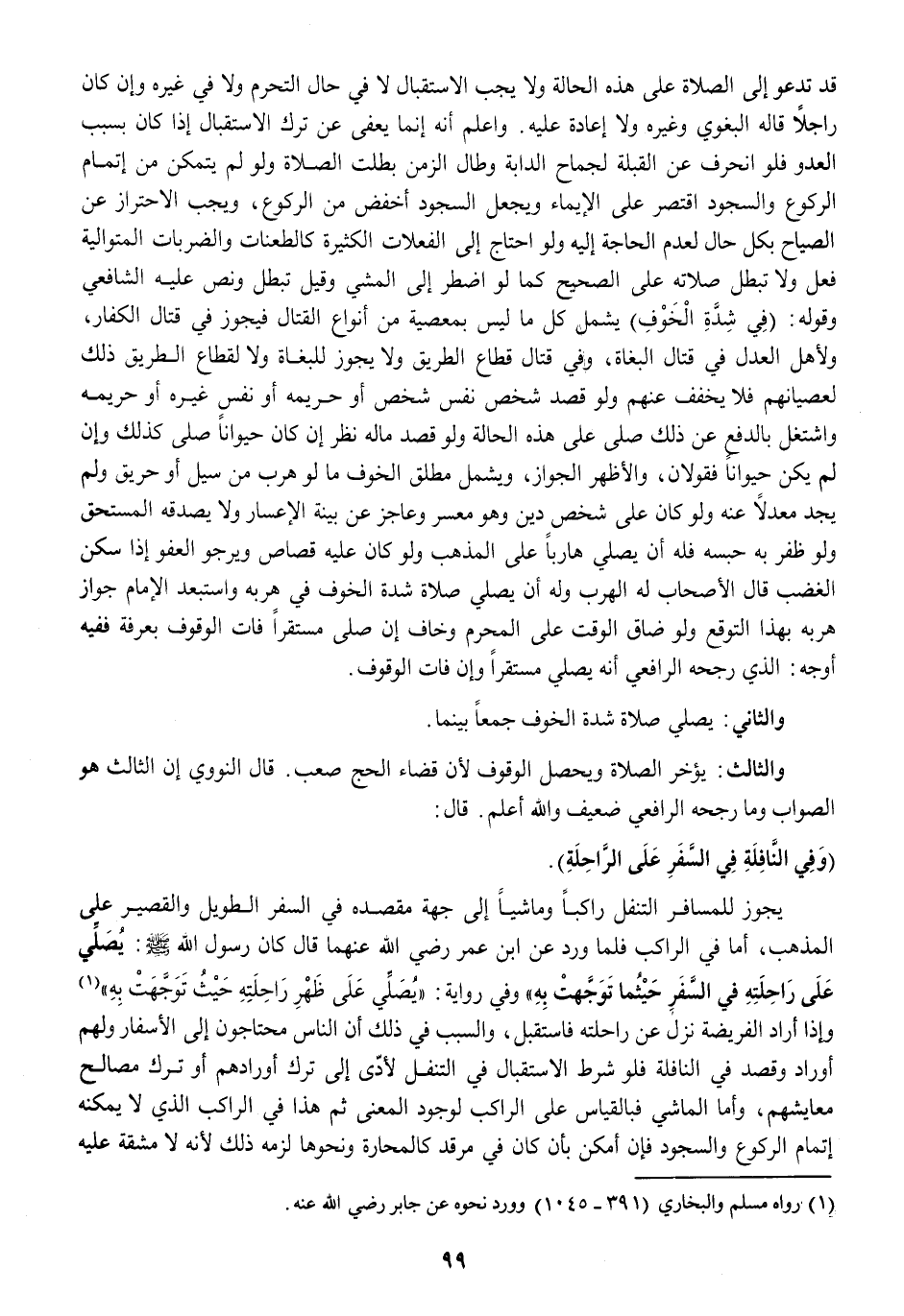 (يُصَلِّي على ظهر رَاحِلَته حَيْثُ تَوَجَّهت بِهِ) وَإِذا أَرَادَ الْفَرِيضَة نزل عَن رَاحِلَته فَاسْتقْبل وَالسَّبَب فِي ذَلِك أَن النَّاس محتاجون إِلَى الْأَسْفَار وَلَهُم أوراد وَقصد فِي النَّافِلَة فَلَو شَرط الِاسْتِقْبَال فِي التَّنَفُّل لَأَدَّى إِلَى ترك أورادهم أَو ترك مصَالح مَعَايشهمْ وَأما الْمَاشِي فبالقياس على الرَّاكِب لوُجُود الْمَعْنى ثمَّ هَذَا فِي الرَّاكِب الَّذِي لَا يُمكنهُ إتْمَام الرُّكُوع وَالسُّجُود فَإِن أمكن بِأَن كَانَ فِي مرقد كالمحارة وَنَحْوهَا لزمَه ذَلِك لِأَنَّهُ لَا مشقة عَلَيْهِ
