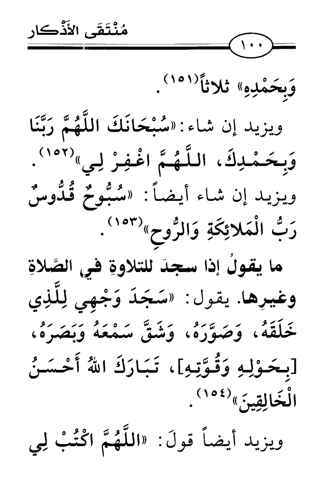 ما يقولُ إذا سجدَ للتلاوةِ في الصَّلاةِ وغيرِها. يقول: «سَجَدَ وَجْهِي لِلَّذِي خَلَقَهُ، وَصَوَّرَهُ، وَشَقَّ سَمْعَهُ وَبَصَرَهُ، [بِحَوْلِهِ وَقُوَّتِهِ] ، تَبَارَكَ اللهُ أَحْسَنُ الْخَالِقِينَ» (¬154) .