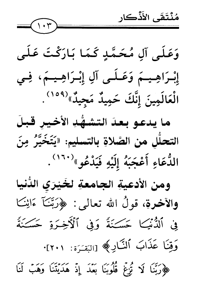 (¬160) أخرجه البخاريّ، كتاب: الأذان، باب: مايتخير من الدعاء بعد التشهد وليس بواجب، برقم (835) ، عن عبد الله بن مسعود رضي الله عنه. ومسلم؛ كتاب: الصلاة باب: التشهد في الصلاة، برقم (402) ، عنه أيضاً، بلفظ: «ثُمَّ يَتَخَيَّرُ مِنَ الْمَسْأَلَةِ مَاشَاءَ» .
