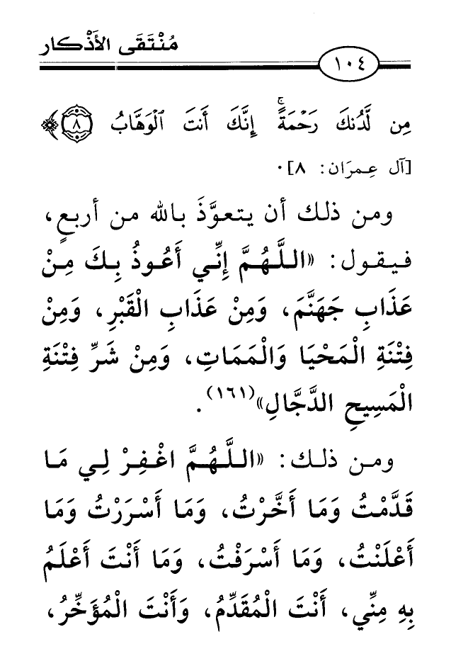 ومن ذلك: «اللَّهُمَّ اغْفِرْ لِي مَا قَدَّمْتُ وَمَا أَخَّرْتُ، وَمَا أَسْرَرْتُ وَمَا أَعْلَنْتُ، وَمَا أَسْرَفْتُ، وَمَا أَنْتَ أَعْلَمُ بِهِ مِنِّي، أَنْتَ الْمُقَدِّمُ، وَأَنْتَ الْمُؤَخِّرُ،