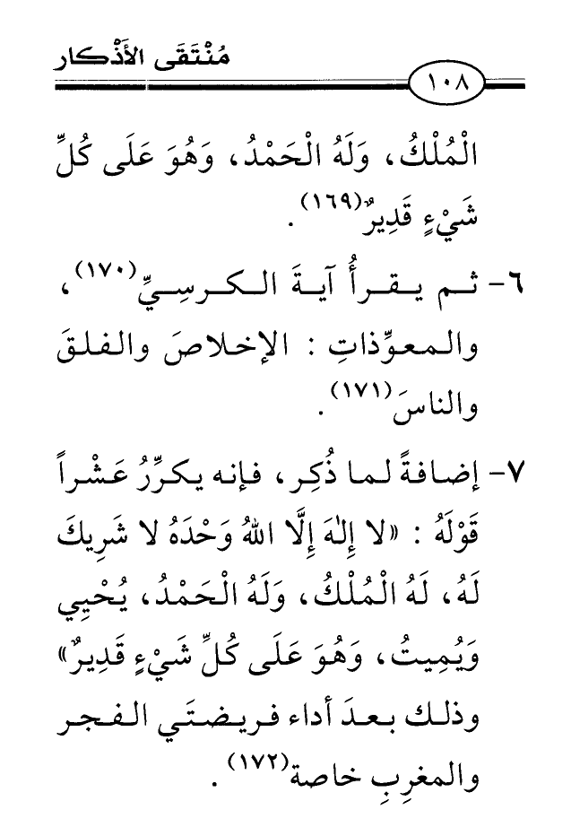 7- ... إضافةً لما ذُكِر، فإنه يكرِّرُ عَشْراً قَوْلَهُ: «لا إِلهَ إِلاَّ اللهُ وَحْدَهُ لا شَرِيكَ لَهُ، لَهُ الْمُلْكُ، وَلَهُ الْحَمْدُ، يُحْيِي وَيُمِيتُ، وَهُوَ عَلَى كُلِّ شَيْءٍ قَدِيرٌ» وذلك بعدَ أداء فريضتَي الفجر والمغرِبِ خاصة (¬172) .
