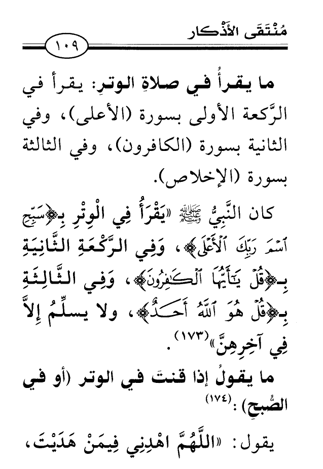 كان النَّبِيُّ صلى الله عليه وسلم «يَقْرَأُ فِي الْوِتْرِ {سَبِّحِ اسْمَ رَبِّكَ الأَْعْلَى} ، وَفِي الرَّكْعَةِ الثَّانِيَةِ {قُلْ يَاأَيُّهَا الْكَافِرُونَ} ، وَفِي الثَّالِثَةِ بِـ {قُلْ هُوَ اللَّهُ أَحَدٌ} ، ولا يسلِّمُ إِلاَّ فِي آخِرِهِنَّ» (¬173) .