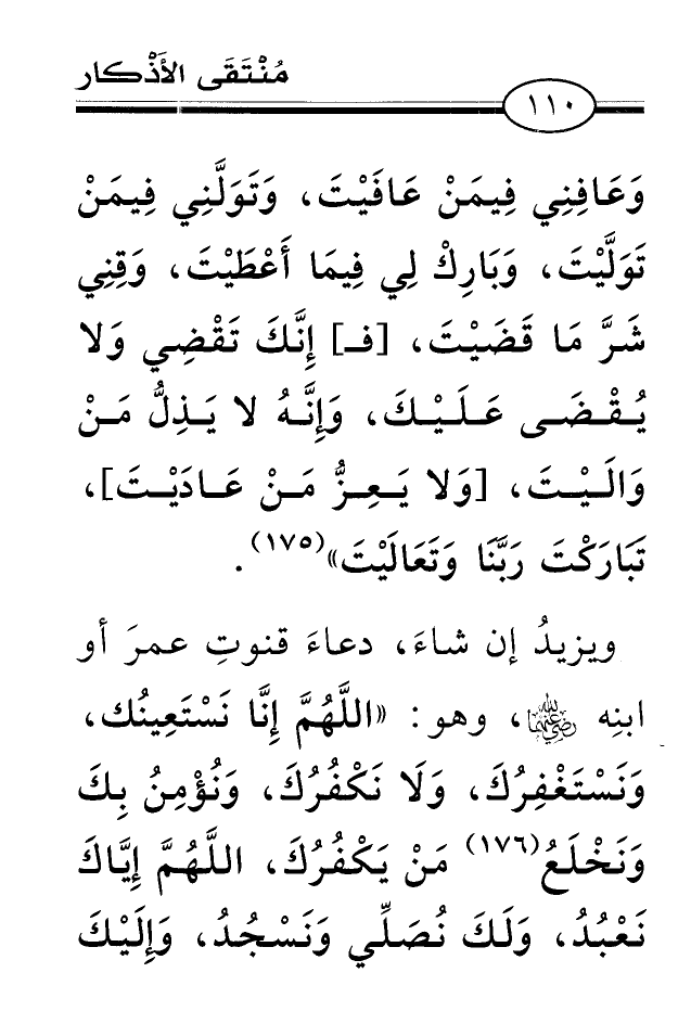(¬175) أخرجه أبو داود؛ كتاب: الوتر، باب: القنوت في الوتر، برقم (1425) ، عن الحسن بن علي رضي الله عنهما. والترمذيُّ، كتاب: أبواب الوتر، باب: ماجاء في القنوت في الوتر، برقم (464) ، عنه أيضاً. بإثبات الفاء من قوله [فَإِنَّكَ] عندالترمذي، وبزيادة [وَلاَيَعِزُّ مَنْ عَادَيْتَ] عند أبي داود.