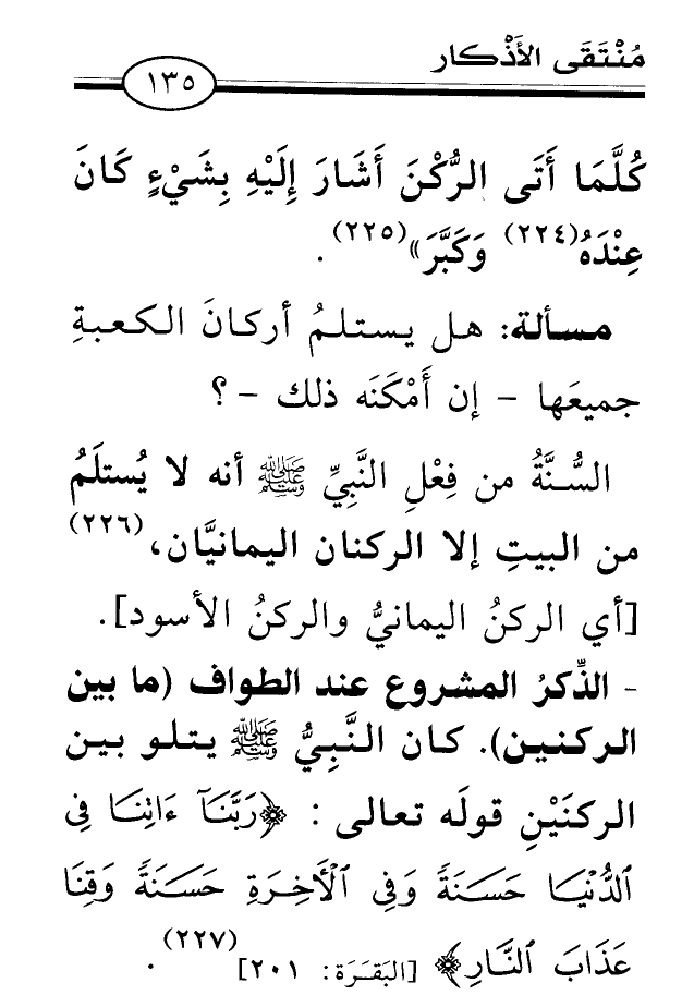 - الذِّكرُ المشروع عند الطواف (ما بين الركنين) . كان النَّبِيُّ صلى الله عليه وسلم يتلو بين الركنَيْنِ قولَه تعالى: [البَقَرَة: 201] (¬227) .