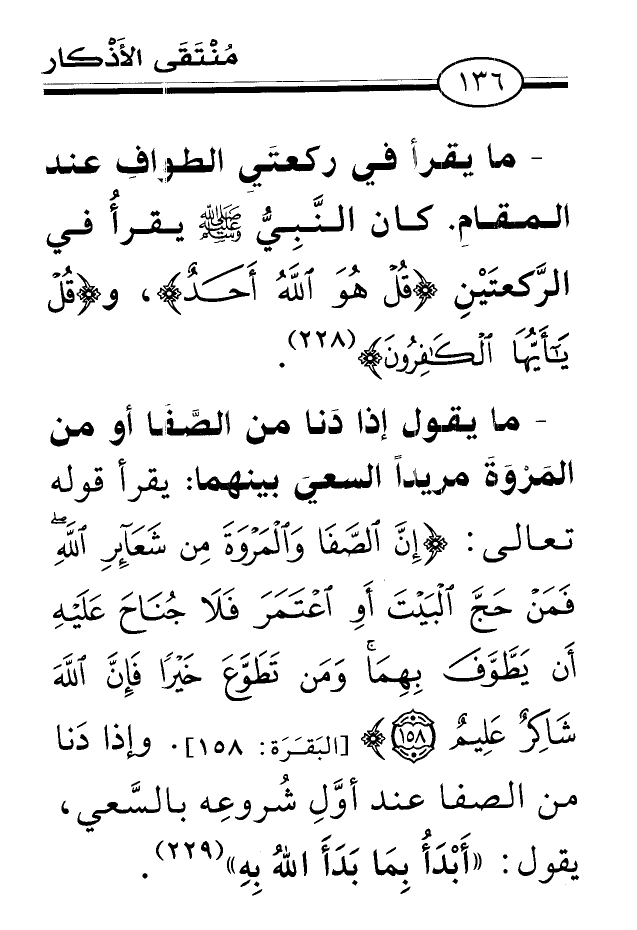 - ما يقول إذا دَنا من الصَّفَا أو من المَرْوَةَ مريداً السعيَ بينهما: يقرأ قوله تعالى: [البَقَرَة: 158] . وإذا دَنا من الصفا عند أوَّلِ شُروعِه بالسَّعي، يقول: «أَبْدَأُ بِمَا بَدَأَ اللهُ بِهِ» (¬229) .
