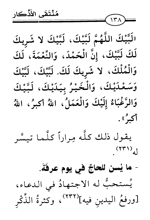 «لَبَّيْكَ اللَّهُمَّ لَبَّيْكَ، لَبَّيْكَ لا شَرِيكَ لَكَ لَبَّيْكَ، إِنَّ الْحَمْدَ، وَالنِّعْمَةَ، لَكَ وَالْمُلْكَ، لا شَرِيكَ لَكَ. لَبَّيْكَ، لَبَّيْكَ وَسَعْدَيْكَ، وَالْخَيْرُ بِيَدَيْكَ، لَبَّيْكَ وَالرَّغْبَاءُ إِلَيْكَ وَالْعَمَلُ، اللهُ أكبرُ، اللهُ أكبرُ» .