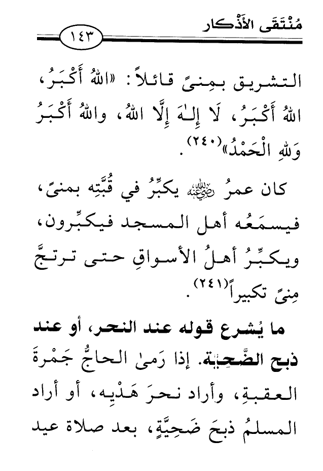 التشريق بمِنىً قائلاً: «اللهُ أَكْبَرُ، اللهُ أَكْبَرُ، لاَ إِلهَ إِلاَّ اللهُ، واللهُ أَكْبَرُ وَللهِ الْحَمْدُ» (¬240) .