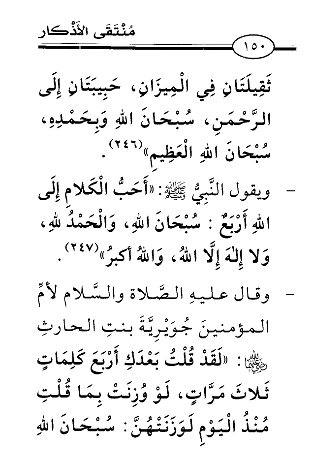 - ... وقال عليهِ الصَّلاة والسَّلام لأمِّ المؤمنينَ جُوَيْرِيَّةَ بنتِ الحارثِ رضي الله عنهما: «لَقَدْ قُلْتُ بَعْدَكِ أَرْبَعَ كَلِمَاتٍ ثَلاثَ مَرَّاتٍ، لَوْ وُزِنَتْ بِمَا قُلْتِ مُنْذُ الْيَوْمِ لَوَزَنَتْهُنَّ: سُبْحَانَ اللهِ