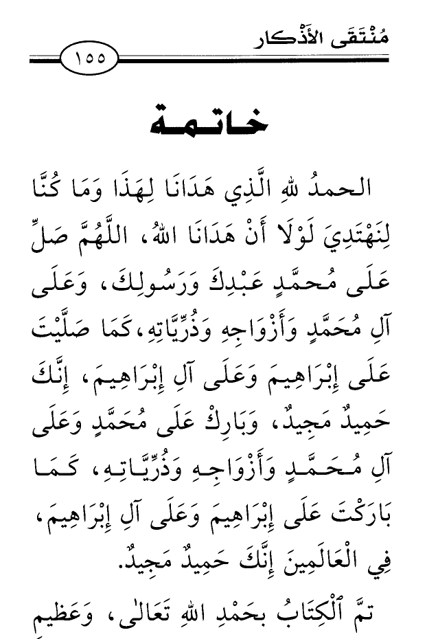 الحمدُ للهِ الَّذِي هَدَانَا لِهَذَا وَمَا كُنَّا لِنَهْتَدِيَ لَوْلاَ أَنْ هَدَانَا اللهُ، اللَّهُمَّ صَلِّ عَلَى مُحمَّدٍ عَبْدِكَ وَرَسُولِكَ، وَعَلَى آلِ مُحَمَّدٍ وَأَزْوَاجِهِ وَذُرِّيَّاتِهِ، كَمَا صَلَّيْتَ عَلَى إِبْرَاهِيمَ وَعَلَى آلِ إِبْرَاهِيمَ، إِنَّكَ حَمِيدٌ مَجِيدٌ، وَبَارِكْ عَلَى مُحَمَّدٍ وَعَلَى آلِ مُحَمَّدٍ وَأَزْوَاجِهِ وَذُرِّيَّاتِهِ، كَمَا بَارَكْتَ عَلَى إِبْرَاهِيمَ وَعَلَى آلِ إِبْرَاهِيمَ، فِي الْعَالَمِينَ إِنَّكَ حَمِيدٌ مَجِيدٌ.