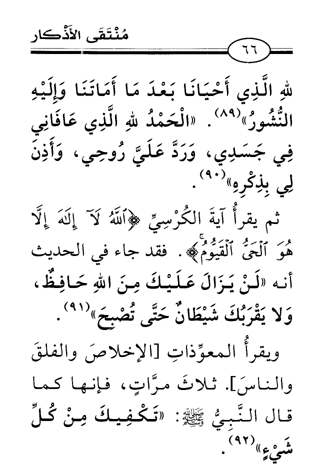 (¬92) أخرجه أبو داود؛ كتاب: الأدب، باب: ما يقول إذا أصبح، برقم (5082) ، عن عبد الله بن خُبيب رضي الله عنه. والترمذي - وصحّحه - كتاب: الدعوات، باب: الدعاء عند النوم، برقم (3575) ، عنه أيضاً.