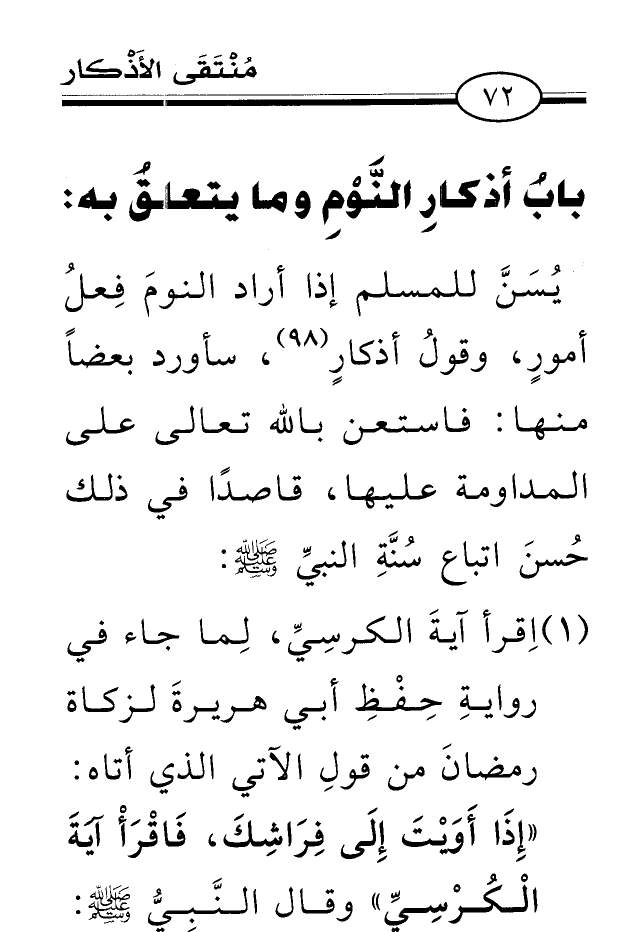 (1) ... اِقرأ آيةَ الكرسِيِّ، لِما جاء في روايةِ حِفْظِ أبي هريرةَ لزكاة رمضانَ من قولِ الآتي الذي أتاه: «إِذَا أَوَيْتَ إِلَى فِرَاشِكَ، فَاقْرَأْ آيَةَ الْكُرْسِيِّ» وقال النَّبِيُّ صلى الله عليه وسلم: