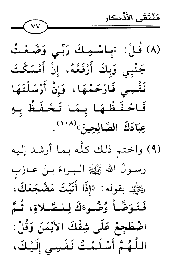 (8) قُلْ: «بِاسْمِكَ رَبِّي وَضَعْتُ جَنْبِي وَبِكَ أَرْفَعُهُ، إِنْ أَمْسَكْتَ نَفْسِي فَارْحَمْهَا، وَإِنْ أَرْسَلْتَهَا فَاحْفَظْهَا بِمَا تَحْفَظُ بِهِ عِبَادَكَ الصَّالِحِينَ» (¬108) .
