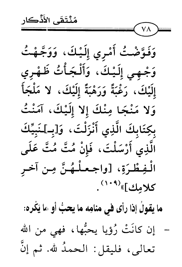(¬109) أخرجه البخاري؛ كتاب: الدعوات، باب: ما يقول إذا نام، برقم (6313) ، عن البراء بن عازب رضي الله عنه. ومسلم؛ كتاب: الذِّكر والدعاء ... ، باب: ما يقول عند النوم، برقم (2710) ، عنه أيضاً. اللفظ المختار لنص الدعاء للبخاري، والزيادة في آخره عند مسلم، وكذلك زيادة الباء من قوله: «وَبِنَبِيِّكَ» .