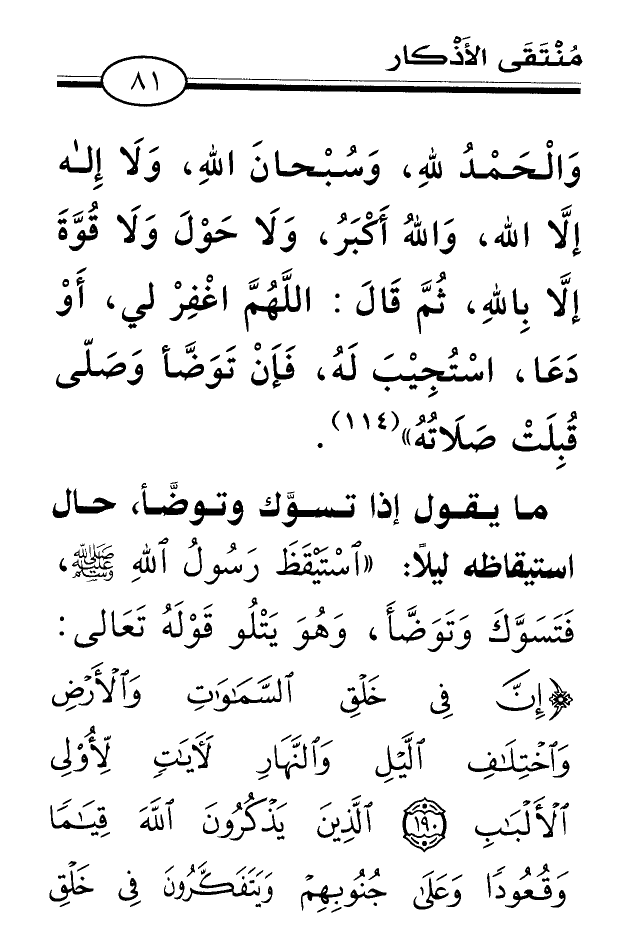 ما يقول إذا تسوَّك وتوضَّأ، حال استيقاظه ليلاً: «اسْتَيْقَظَ رَسُولُ اللهِ صلى الله عليه وسلم، فَتَسَوَّكَ وَتَوَضَّأَ، وَهُوَ يَتْلُو قَوْلَهُ تَعَالى: [آل عِمرَان: 190-194] {إِنَّ فِي خَلْقِ السَّمَاوَاتِ وَالأَرْضِ وَاخْتِلاَفِ اللَّيْلِ وَالنَّهَارِ لآَيَاتٍ لأُِولِي الأَلْبَابِ *الَّذِينَ يَذْكُرُونَ اللَّهَ قِيَامًا وَقُعُودًا وَعَلَى جُنُوبِهِمْ وَيَتَفَكَّرُونَ فِي خَلْقِ