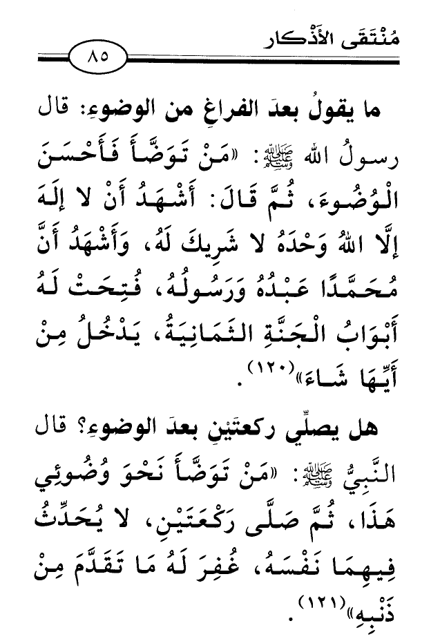 (¬120) أخرجه مسلم؛ كتاب: الطهارة، باب: الذِّكر المستحبِّ عَقِب الوضوء، برقم (234) ، عن عقبةَ بن عامر رضي الله عنه، والترمذيُّ، كتاب: الطهارة، باب: فيما يقال بعد الوضوء، برقم (55) ، عن عمرَ رضي الله عنه.