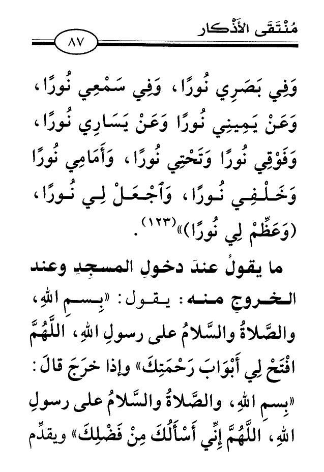 ما يقولُ عندَ دخولِ المسجِدِ وعند الخروجِ منه: يقول: «بِسمِ اللهِ، والصَّلاةُ والسَّلامُ على رسولِ اللهِ، اللَّهُمَّ افْتَحْ لِي أَبْوَابَ رَحْمَتِكَ» وإذا خرَجَ قالَ: «بِسمِ اللهِ، والصَّلاةُ والسَّلامُ على رسولِ اللهِ، اللَّهُمَّ إِنِّي أَسْأَلُكَ مِنْ فَضْلِكَ» ويقدِّم