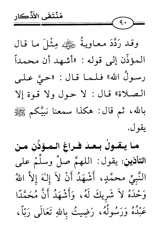 وقد رَدَّدَ معاويةُ رضي الله عنه مِثْلَ ما قال المؤذّن إلى قوله: «أشهد أن محمداً رسولُ الله» فلما قال: «حيَّ على الصلاة» قال: لا حول ولا قوة إلا بالله، ثم قال: هكذا سمعنا نبيَّكم صلى الله عليه وسلم يقول.