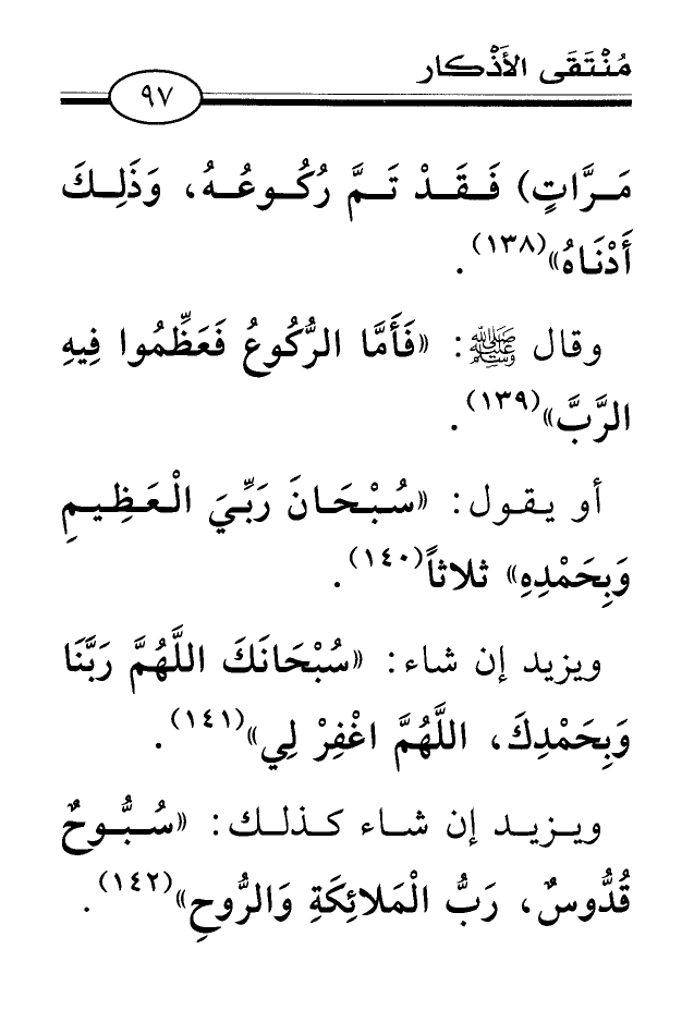 (¬141) أخرجه البخاري، كتاب: الأذان، باب: الدعاء في الركوع، برقم (794) ، عن عائشة رضي الله عنها. ومسلم؛ كتاب: الصلاة، باب: ما يقال في الركوع والسجود، برقم (484) ، عنها أيضًا.