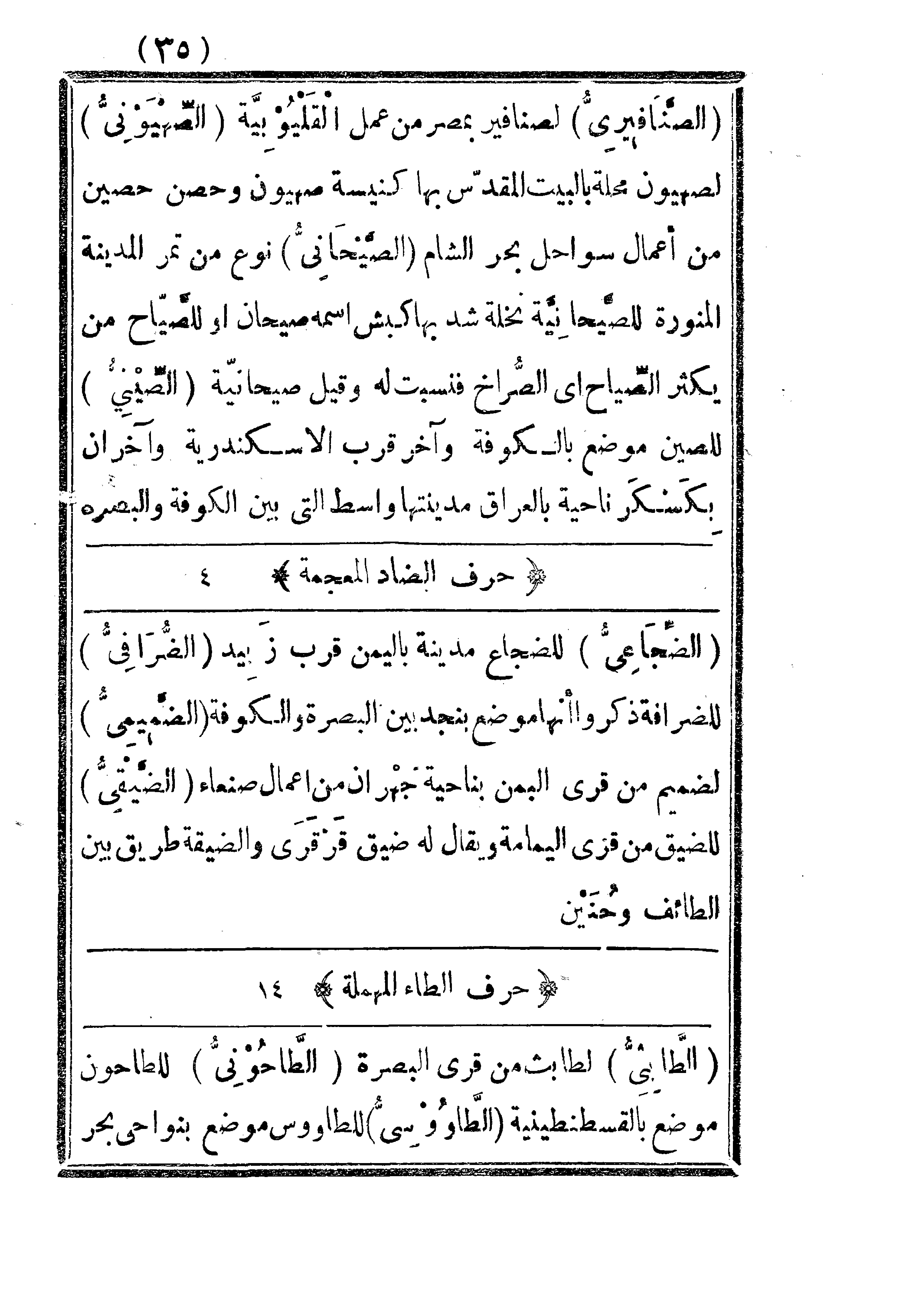 الطابثي: لطابث من قرى البصرة. الطاحوني: للطاحون موضع بالقسطنطينة. الطاووسي: للطاووس موضع بنواحي بحر